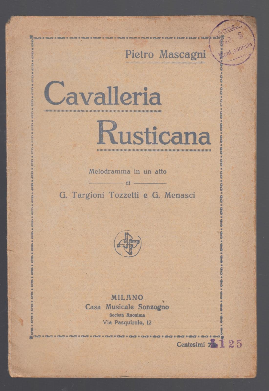PIETRO ASCAGNI CAVALLERIA RUSTICANA MILANO SONZOGNO 1918 LIBRETTO D'OPERA COPERTINA EDITORIALE CON TIMBRO VECCHIO TIMBRO ALL'ANGOLO SUPERIORE DESTRO, TIMBRO PRESENTE ANCHE ALLA PRIMA PAGINA, QUALCHE MACCHIA, PICCOLE PIEGHE AGLI ANGOLI, N. PAG. 31 CM. 20,5 X 14,5