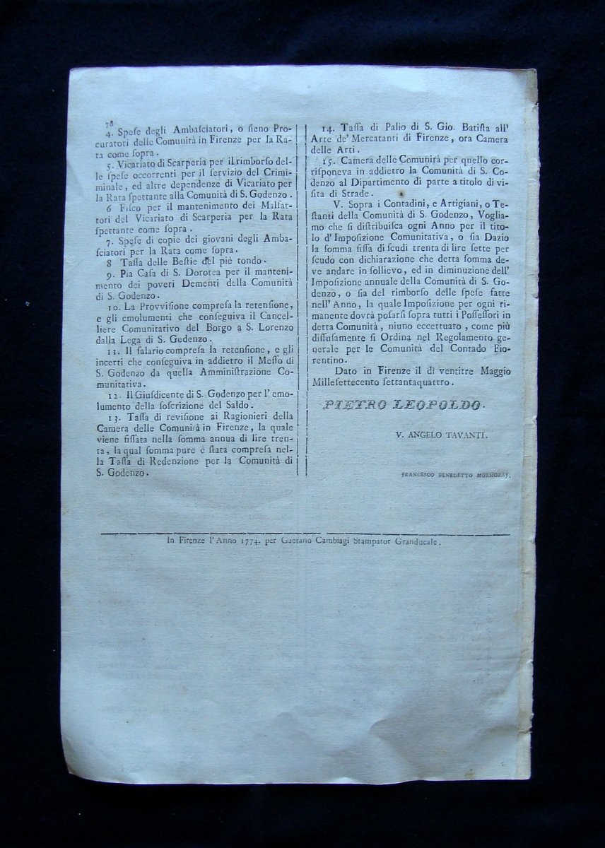 Num.XXXIX Regolamento locale per la comunità di S. Godenzo Pietro Leopoldo per grazia di Dio . Granduca di Toscana Gaetano Cambiagi Stampator Granducale, Firenze 1774; cm.40,5 x 27 cm, 1 foglio fronte/retro originale e completo, bel fregio xilografico in prima pagina, testo su due colonne. Condizioni di conservazione Esemplare in ottimo stato di conservazione con leggere tracce del tempo. Tracce di antica fascicolazione sul dorso. SC03.D14981F blu