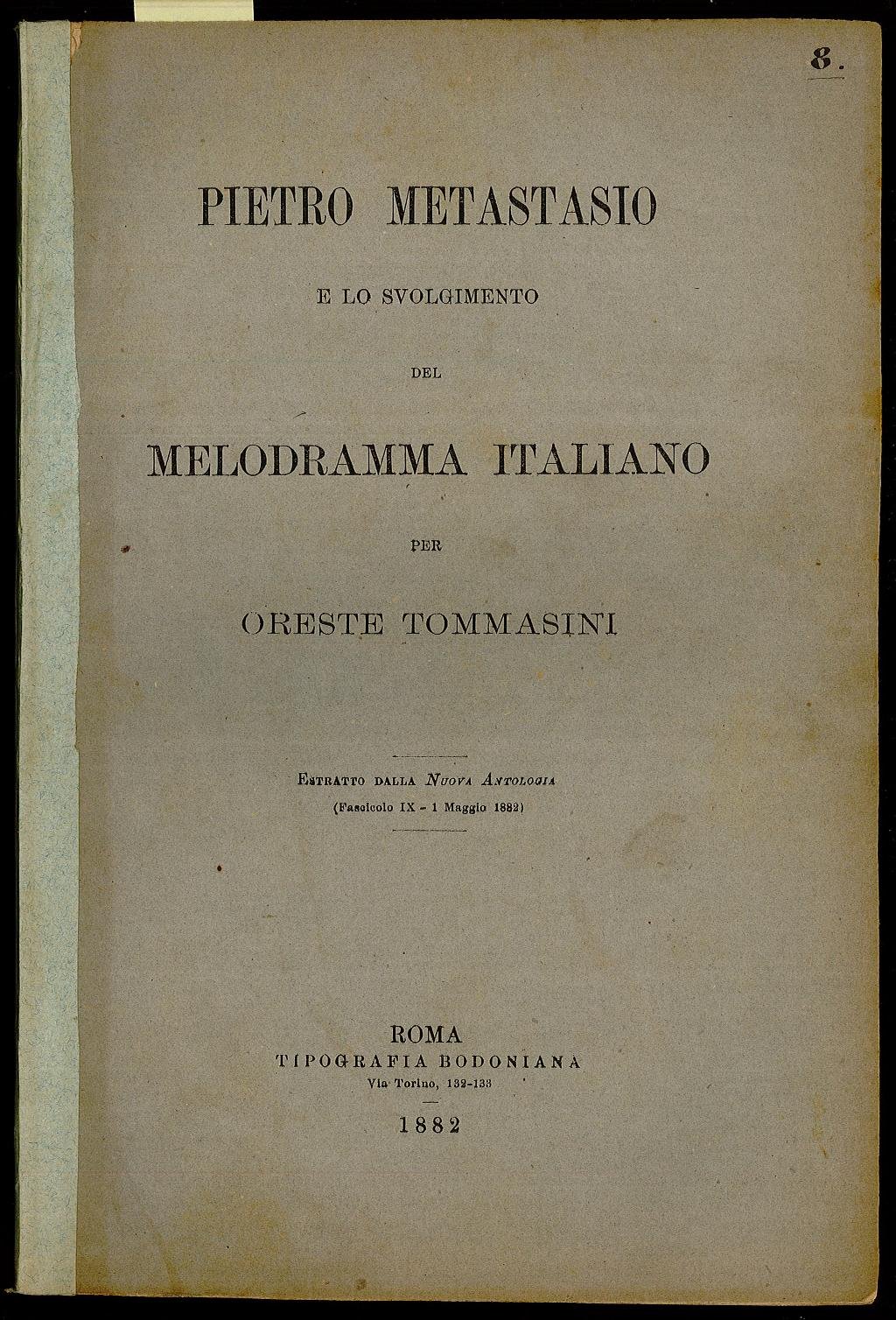 Opuscolo vintage. Estratto dalla “Nuova Antologia” (fascicolo IX – 1 maggio 1882). Dedica autografa dell’autore. Restauro al dorso. Segno del tempo.