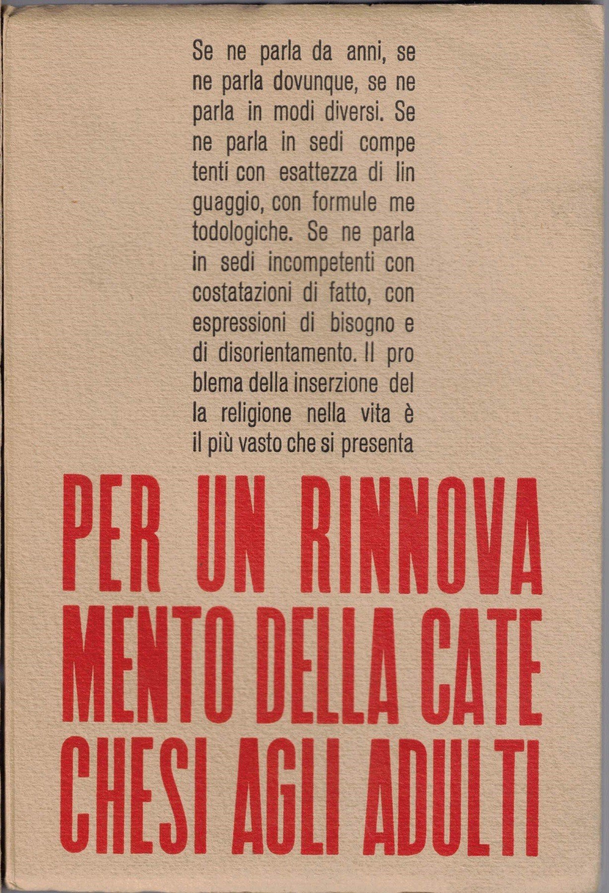 L. (Luigi) M. Pignatiello, Per un rinnovamento della catechesi agli adulti, Edizioni Paoline, s.l. (ma stampato a Roma, presso la Tipografia Figlie di S. Paolo) 1962, pp. 110, cm 20, br. ed. con alette. Breve annotazione alla prima carta. Minime tracce d’uso, leggera brunitura della carta, per il resto perfetto.