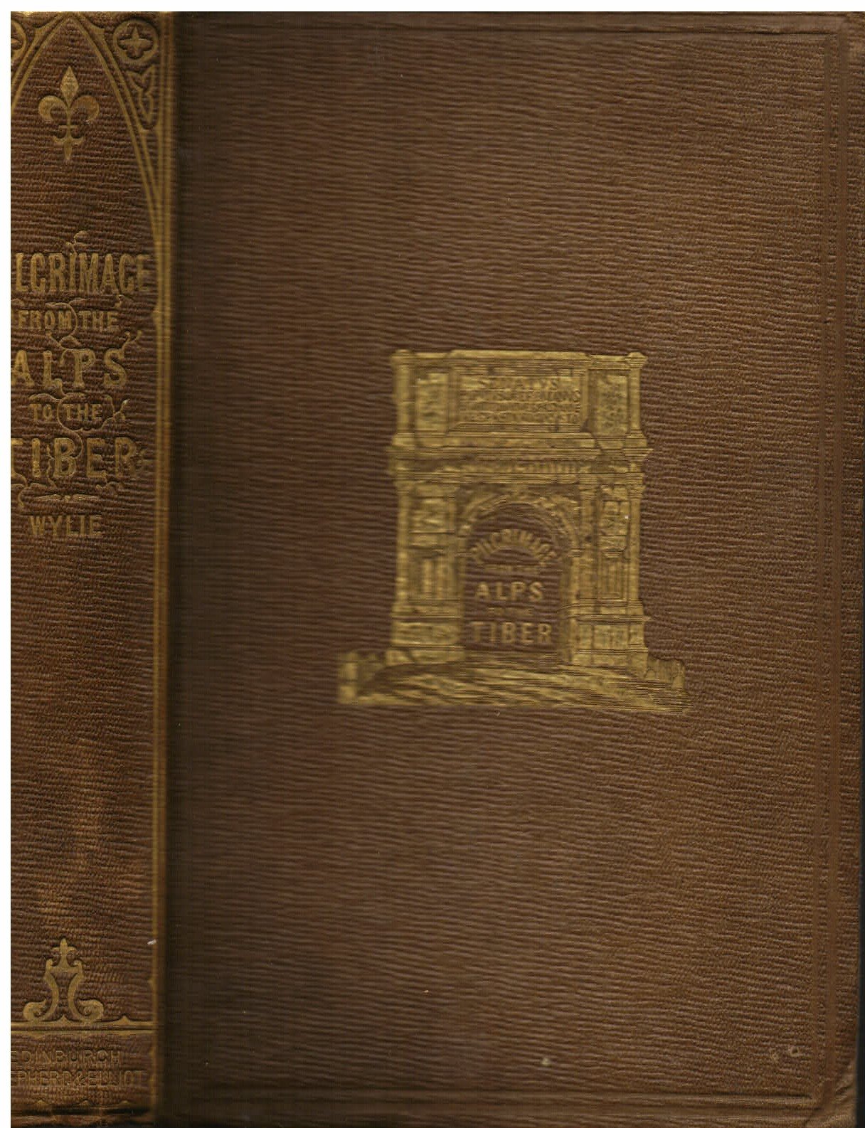 In-8° (200x125mm), pp. (4), III, 455, legatura editoriale t. tela marrone con titolo e figura di un arco romano in oro al piatto. Titolo e impressioni in oro al dorso. Dedica autografa dell'editore all'occhietto. Ottimo stato. Prima edizione, rara. L'itinerario di viaggio in Italia del Wylie si snoda attraverso le seguenti località: le Valli Valdesi del Piemonte, Torino, Novara, Milano, Brescia, il Lago di Garda e Peschiera, Verona, Venezia, Padova, Ferrara, Bologna, Firenze, Livorno, Civitavecchia, Roma (città cui è dedicata la maggior parte del volume). Degne di nota le osservazioni dell'autore sulla nascita e il progresso del costituzionalismo in Piemonte, su Olimpia Morata a Ferrara, sulla giustizia e la libertà negli Stati Pontifici, ecc.; particolare risalto hanno le notazioni dedicate alle varie confessioni religiose e alla presenza protestante in Italia. Il Wylie (Kirriemuir, Scozia, 1808-Edimbrgo, 1890) fu storico delle religioni e ministro presbiteriano, particolarmente noto per la sua pregevole 'History of Protestantism'. Pine-Coffin, 851/5.