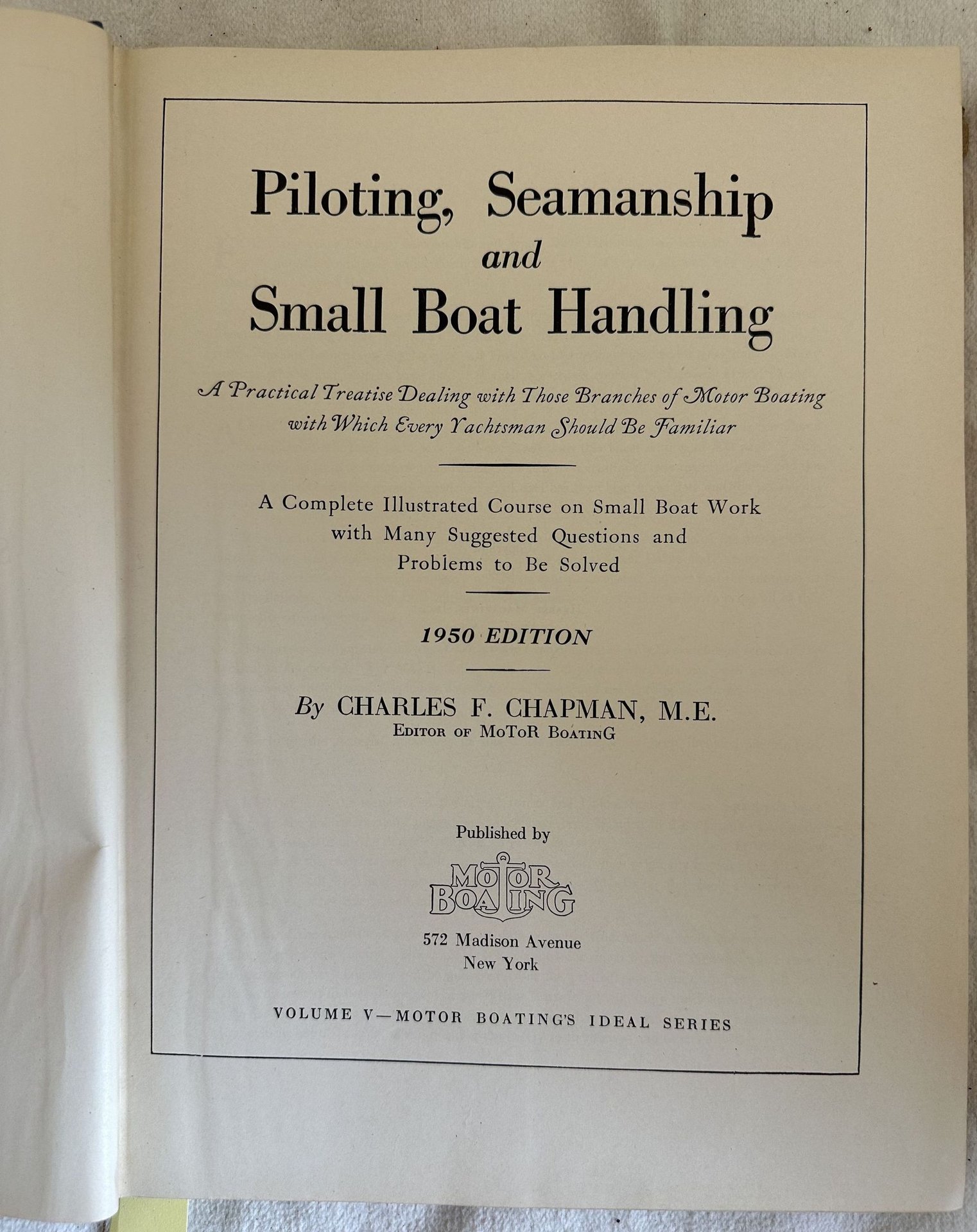 Edizione del 1949 di questo manuale sulla gestione delle piccole barche di Charles Chapman. All'interno regole di navigazione, equipaggiamento e luci per tutti i tipi di vascello, gestione del motore, sicurezza in mare, compassi, aiuti alla navigazione, pilotaggio, modi della navigazione ec. Numerose illustrazioni e foto a colore e in bianco e nero. In ottime condizioni. Copertina in tela editoriale con sovraccoperta in ottime condizioni generali con lievi usure ai margini e dorso. Legatura in buone condizioni. All'interno le pagine si presentano in ottime condizioni con rare fioriture. In 8. Dim. 30x22 cm. Pp. 500.Edition of 1949 of this volume about the management of little boats by Charles Chapman. inside: Equipment and lights for all types of vessels, rules of the road at sea, Moto boat handling, Safety at sea, The mariner's Compass, Aids to navigation, Charts and piloting, Manners and customs on shipboard etc. In very good conditions Cloth editorial cover with dustjacket in very good general conditions lightly worn in the extremities. Binding in good conditions. Inside pages are in very good conditions with occasional foxing. In 8. Dim. 30x22 cm. Pp. 500.<BR><BR>