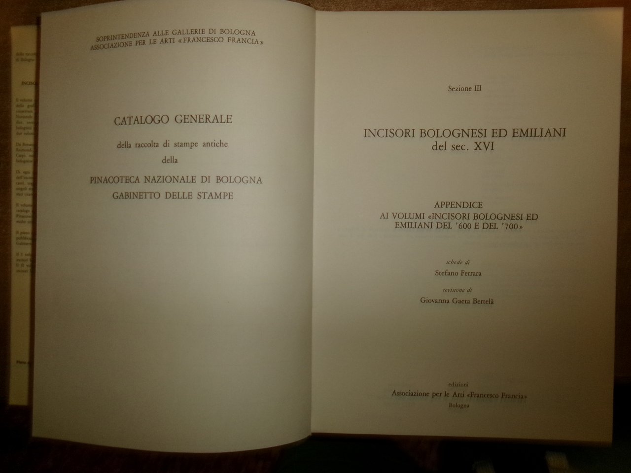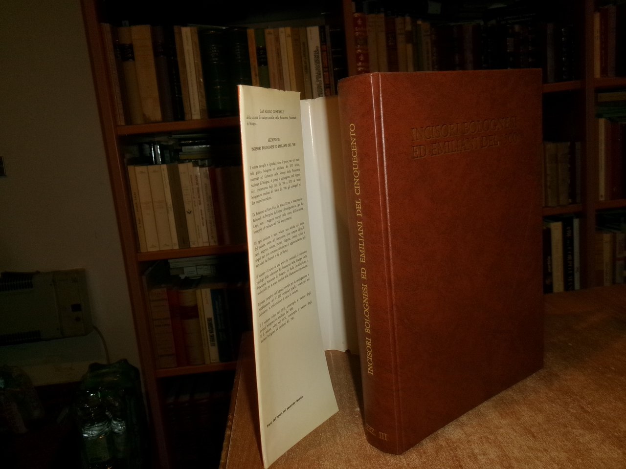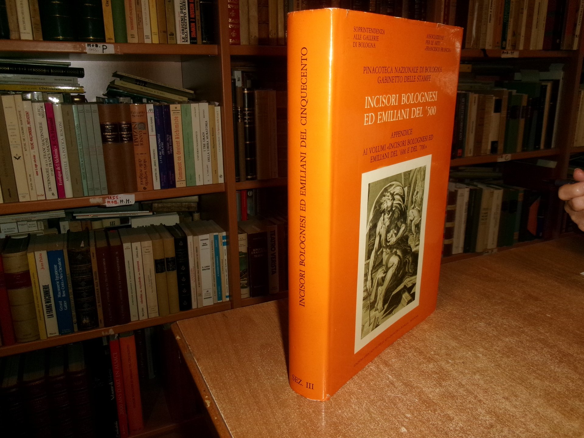 Pinacoteca Nazionale di Bologna. Incisori bolognesi ed emiliani del 500' appendice ai volumi << Incisori bolognesi ed emiliani del 600' e del 700'. Catalogo generale della raccolta di stampe antiche della Pinacoteca di Bologna. Volume unico. In-4°, similpelle con titoli in oro sul piano e al dorso, volume con pagine non numerate, 870 riproduzioni di incisioni di noti maestri. Ottimo stato con piccolo strappetto nelle sovracop. posteriore. Neg. mass. (nostro).