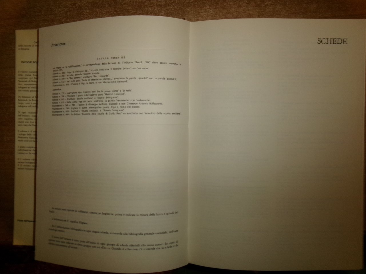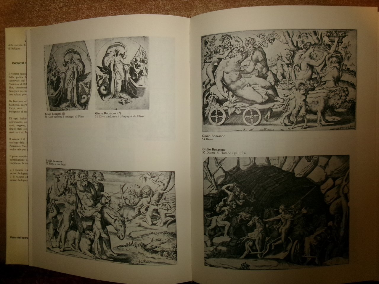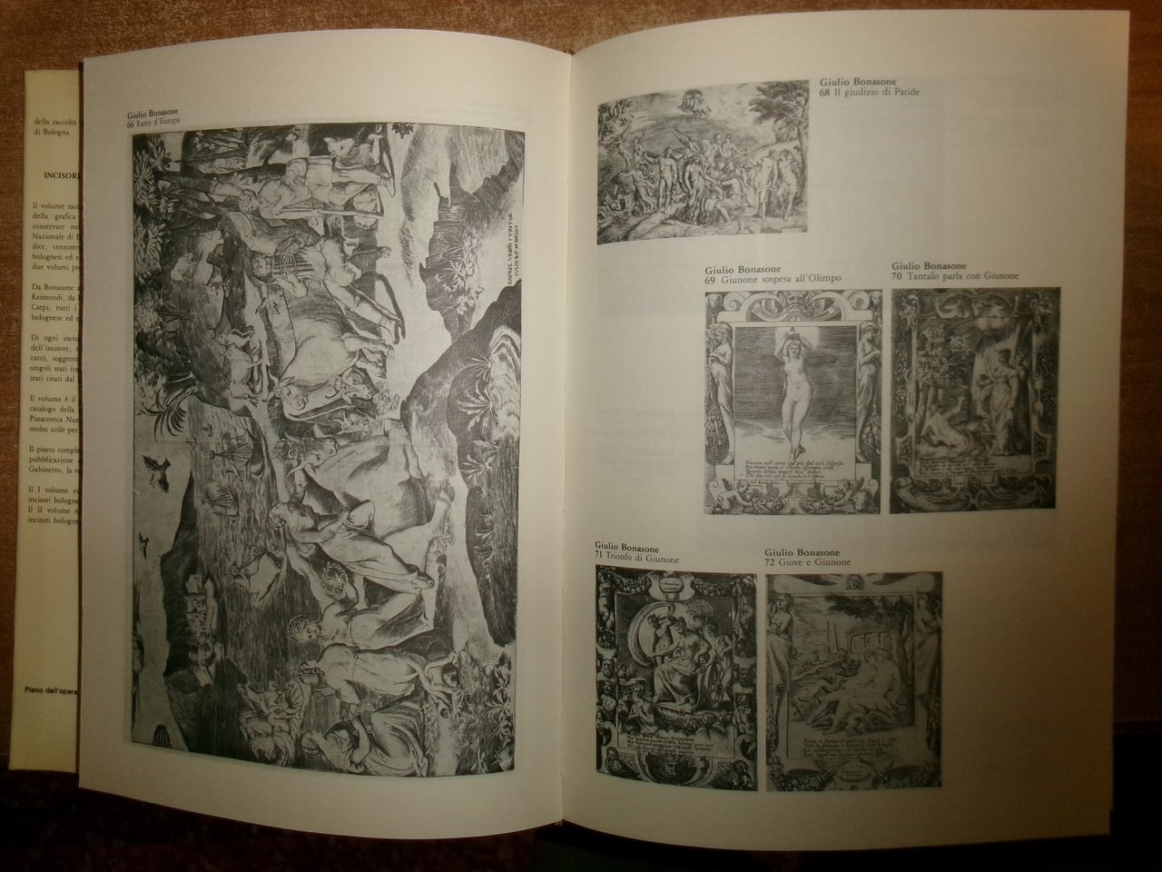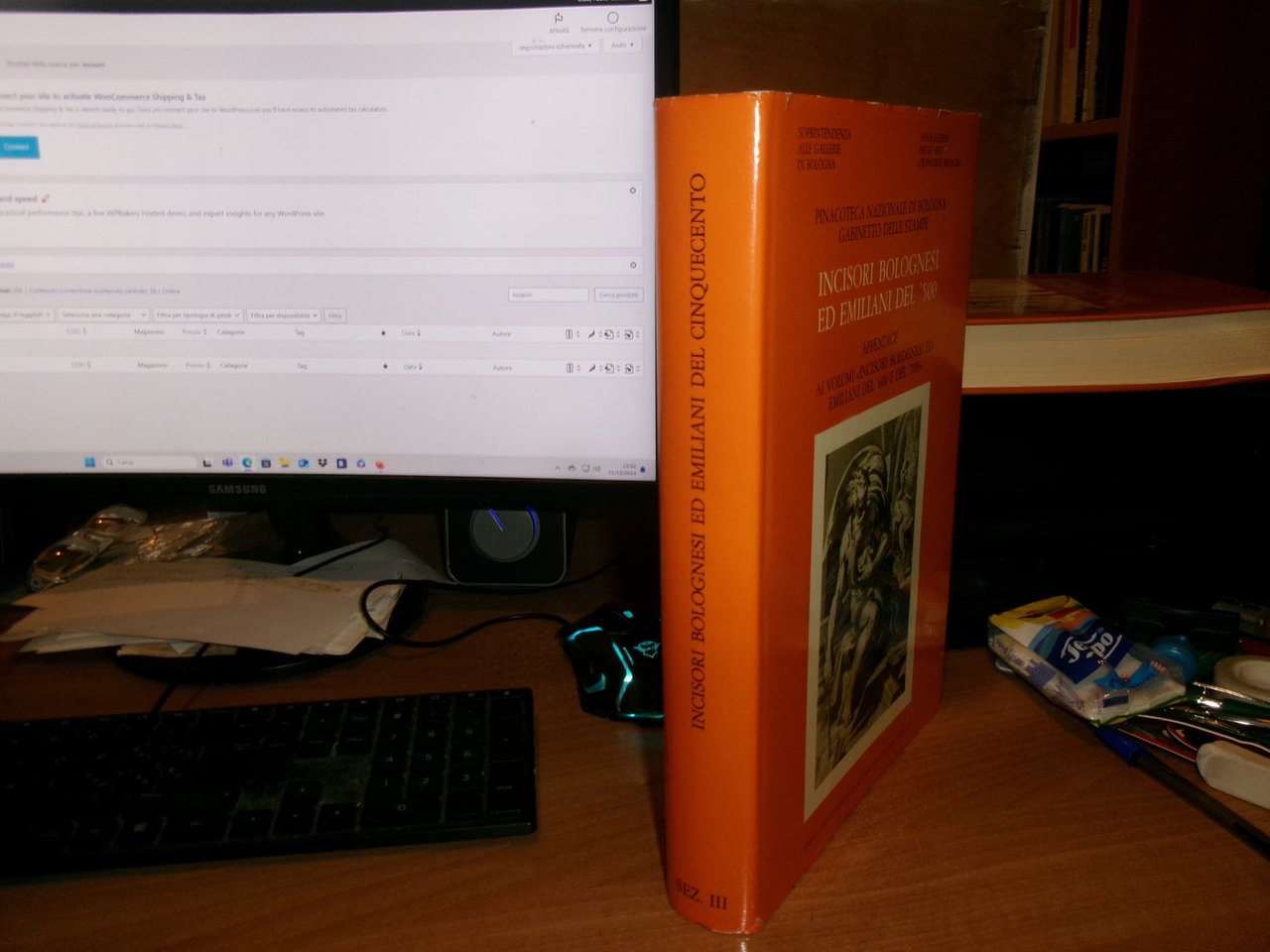 Pinacoteca Nazionale di Bologna. Incisori bolognesi ed emiliani del 500' appendice ai volumi << Incisori bolognesi ed emiliani del 600' e del 700'. Catalogo generale della raccolta di stampe antiche della Pinacoteca di Bologna. Volume unico. In-4°, similpelle con titoli in oro sul piano e al dorso, volume con pagine non numerate, 870 riproduzioni di incisioni di noti maestri. Ottimo stato con piccolo strappetto nelle sovracop. posteriore. Neg. mass. (nostro).