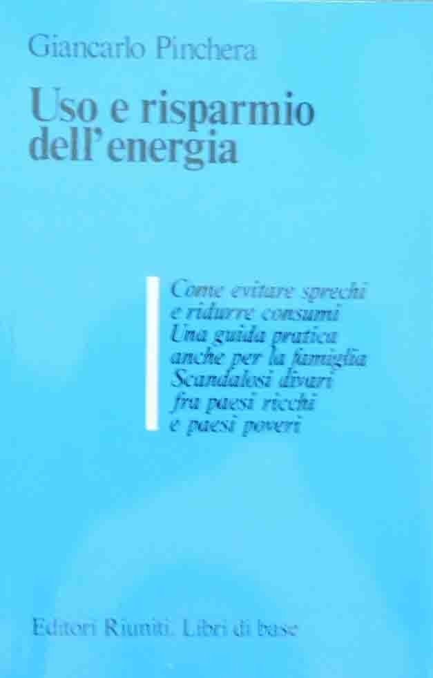 Giancarlo Pinchera, Uso e risparmio dell’energia, Editori Riuniti, Roma 1981, pp. 173, ill. b.n., cm 20, br. ed. Collana Libri di base, n. 28. Sezione 5. Economia e lavoro: organizzazione e tecnologie. Alla prima di copertina: Come evitare sprechi e ridurre consumi. Una guida pratica anche per la famiglia. Scandalosi divari fra paesi ricchi e paesi poveri. Minima brunitura della carta, per il resto ben conservato.
