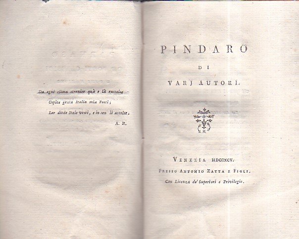In-8° antico, pp. 408, brossura decorata originale con titolo a stampa su tassello cartaceo al dorso. Freschissimo esemplare in barbe e a fogli chiusi. Contiene anche la traduzione di Onofrio Gargiulli de 'La Tavola di Cebete Tebano' e, di Saverio Mattei, di 'Ortio o sia poetica litania etrusca per imepetrar la pioggia in tempo di siccità'. Parnaso de'Poeti Classici d'ogni nazione, tomo decimoquinto.
