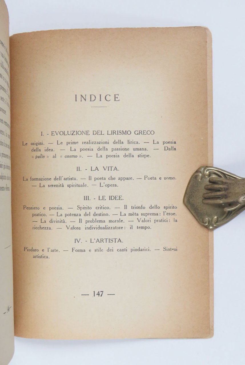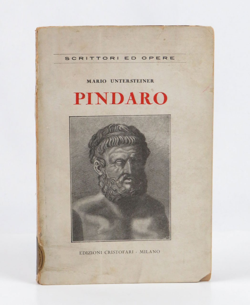 LIBROPrima edizione.CON AUTOGRAFO.Esemplare pregiato da dedica autografa dell’autore all’antiporta datata 3 settembre 1944, in stato più che buono (brossura con normali segni del tempo e piccola mancanza all’angolo inferiore destro del piatto anteriore, tracce di sporco, abrasioni al dorso; carte perimetralmente brunite. Pecetta “Letter. 27” al dorso.Rarissima opera prima di Mario Untersteiner edita dalla milanese Cristofari nel 1931. Dopo le curatele giovanili dedicate a Eschilo, Sofocle ed Euripide e all’Edipo a Colono sofocleo del 1924 e del 1929, qui il futuro professore di Letteratura greca all’Università di Genova e di Storia della filosofia antica all’Università di Milano si confronta direttamente con uno dei massimi rappresentanti della lirica greca, ovvero il poeta tebano Pindaro, inquadrandone attentamente il contesto storico, la vita e la visione etica e poetica. Originario di Rovereto ma trasferitosi a Milano con la famiglia già nel 1915, Mario Untersteiner rifiutò nel 1939 una cattedra all’Università di Genova per non doversi tesserare al Partito Fascista, dando inizio alla propria carriera accademica solo dopo la Liberazione. Studioso profondo animato da autentica passione pedagogica, Untersteiner ha lasciato scritti ancora fondamentali sulla letteratura classica greca e sui Sofisti, da lui affrancati da interpretazioni riconducibili all’utilitarismo e resi invece esponenti del più sincero spirito tragico.