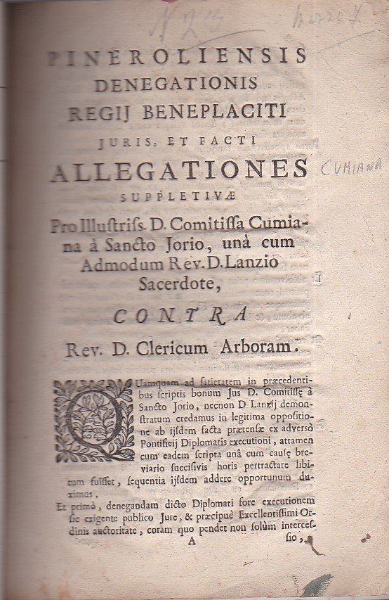 Pineroliensis Denegationis Regij Beneplaciti Juris, et facti Allegationes Suppletivae Pro Illustriss. D. Comitissa Cumiana à Sancto Jorio, una cum Admodum Rev. D. Lanzio Sacerdote, contra Rev. D. Clericum Arboram