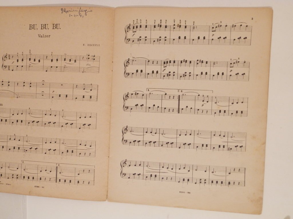 In-folio, cm 32, uno spartito musicale di pp. 19. Bella brossura editoriale illustrata da Casaltoli, Ottimo stato di conservazione. Al piatto: Album ricreativo nell'estensione delle 5 note a 2 e 4 mani. Ai miei cari nipotini Adorno e Rosina Ceresoli. . *** TUTTI I NOSTRI LIBRI SONO VISIBILI PREVIO CONTATTO MAIL O TELEFONO NELLA NUOVA SEDE DI MILANO: LIBRERIA COSMOPOLIS, VIA JOMMELLI, 22. ***