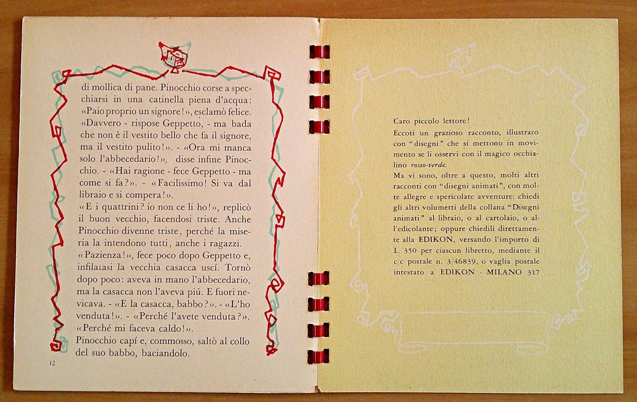Quarta puntata de "Le Avventure di Pinocchio". Collana Disegni Animati N.9. Illustrazioni a colori n.t. di René. Con Occhialini. Ed. Edikon - Milano, 1963. Cartonato editoriale con dorso a spirale. 17,5x21; pp.12. Ottimo stato. , Ottimo (Fine)