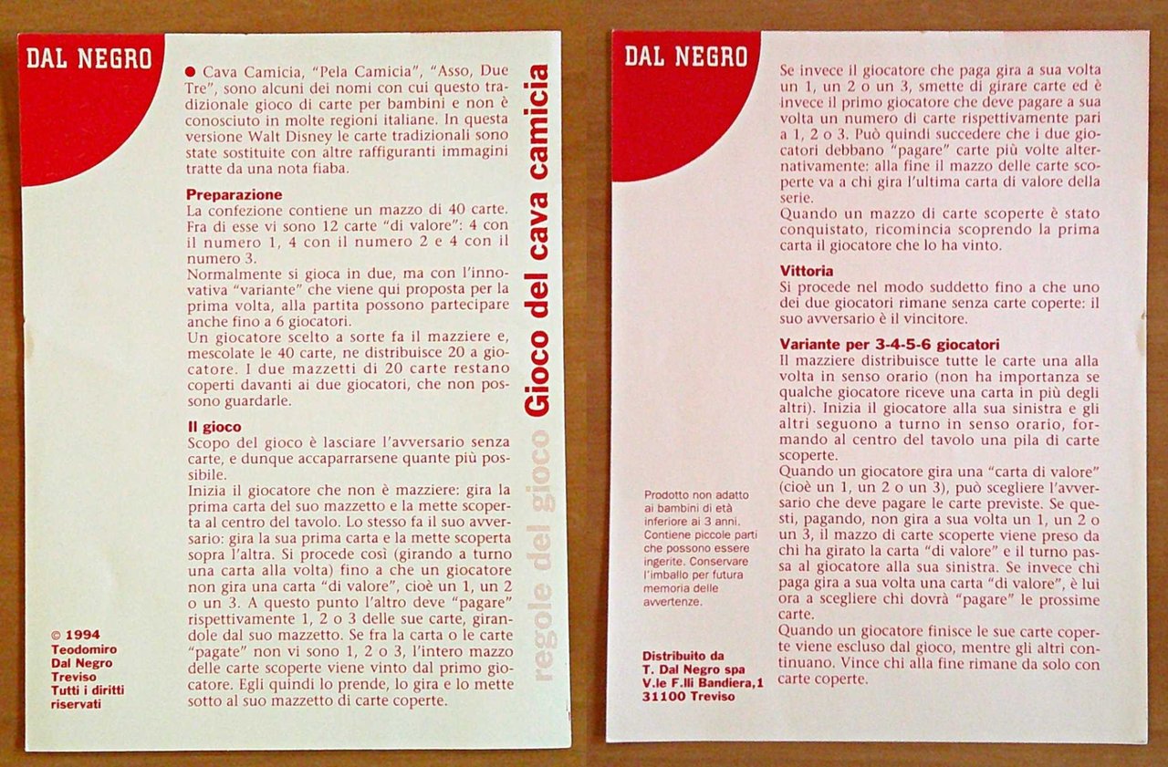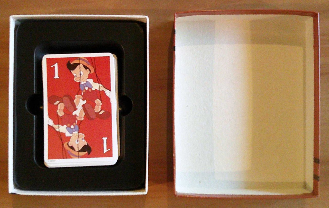 Gioco in scatola. Walt Disney's Pinocchio. Gioco del Cava Camicia. 40 carte da Gioco in Scatola originale. Il mazzo di 40 carte, tra cui 12 "di valore": 4 con il numero 1, 4 con il numero 2, e 4 con il numero 3. Le restanti carte rappresentano scene del cartone animato di Walt Disney (ogni scena ripetuta 4 volte). Dal Negro - Treviso, 1994. Scatola cartonata in cartone contenente le carte e le istruzioni. Scatola 12,5x16. Stato di Nuovo. , Perfetto (Mint)