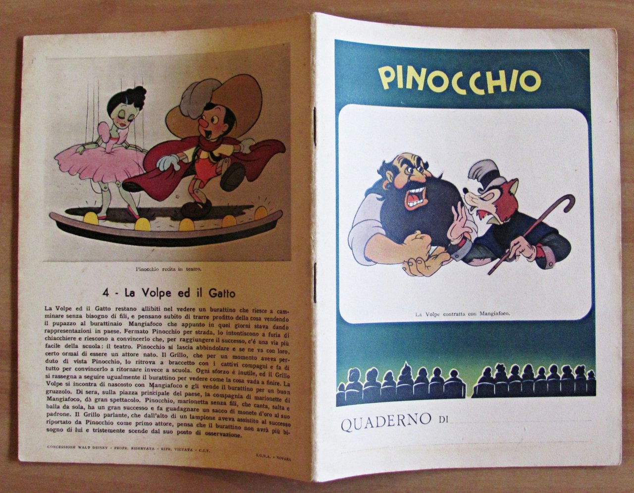 Quaderno per la quinta elementare. Pinocchio N.4 La Volpe ed il Gatto - s.d., anni '40/50. Quaderno per la quinta elementare, con copertine a colori. 15x20. Stato di Nuovo. , Perfetto (Mint)