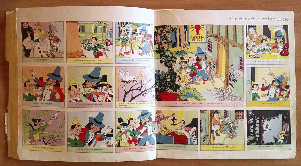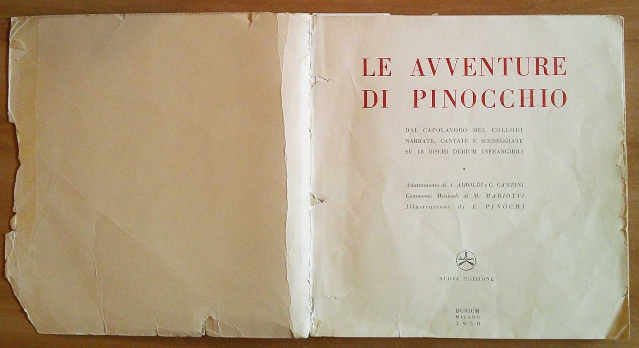 Dal capolavoro di Collodi narrate, cantate e sceneggiate su 18 dischi Durium infrangibili. Adattamento di A. Airoldi e G. Cantini; commenti musicali di M. Mariotti. Illustrazioni a colori a fumetti a tutte le pagine del libro in brossura di E. Pinochi. Ed. Durium - Milano, 1950. Collezione Completa composta da Raro cofanetto completo della custodia editoriale in cartone, contenente un libro brossura a fumetti, e 18 dischi in cartone. Cofanetto con minimi segni del tempo al dorso e spellature alla retrocopertina. Brossura con mancanze e segni del tempo soprattutto alle copertine. Custodia 28x28; Brossura 25x25, pp.36; Dischi diametro cm 24. Rara collezione Completa in Buonisismo stato. , Molto buono (Very Good)