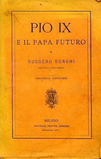 In-8°, pp. (4), 290, brossura editoriale arancio con titolo entro duplice filetto. Fioriture. Bell'esemplare in barbe. Seconda edizione, contemporanea alla prima. Il libro, uscito poco prima della morte di Pio IX, a conclusione di un pontificato trentennale, scatenò aspre polemiche per l'impostazione fieramente laica con cui esso era stato scritto e per l'auspicio che i cattolici italiani confluissero in un grande partito conservatore nazionale. In esso il Bonghi discorre della storia dei conclavi e dei loro mutamenti, della loro organizzazione, delle ingerenze politiche nell'elezione dei papi, dell'elezione al soglio pontificio secondo il diritto ecclesiastico e del conclave futuro; in fine è riportata un'appendice di documenti. Il Bonghi (Napoli, 1826-Torre del Greco, 1895) fu celebre statista della Destra storica, Ministro della Pubblica Istruzione, critico, filologo, amico del Manzoni e del Rosmini.
