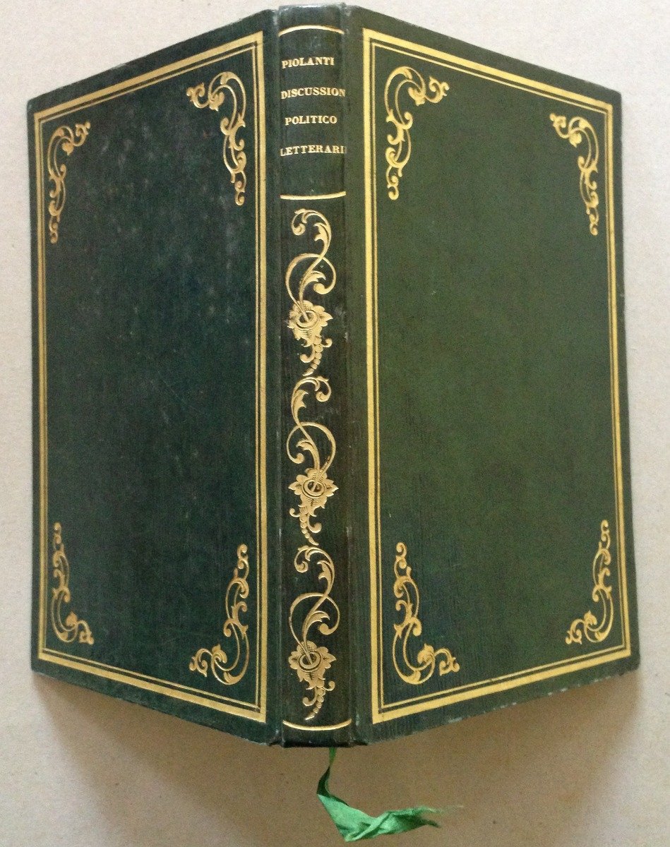 G. Piolanti, Discussioni politico-letterarie Tipi di Andrea Rossi, Modena, 1850; cm. 20x13; pp. 216; discussioni politico-letterarie contenenti la storia filosofica dell'ultima Rivoluzione d'Italia, dialogo tra l'autore e l'Ab. Vincenzo Gioberti; bella legatura d'epoca t. pelle con fregi al dorso e ai margini. Condizioni di conservazione Volume ben conservato con leggere tracce d'uso e del tempo; interni leggermente bruniti. SETT87.L18429 MT