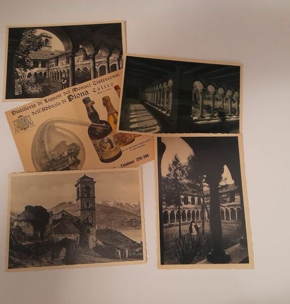 5 cartoline,con 3 in bianco e nero del 1940 con vedute dall'interno del Chiostro e 1 veduta dassieme. 1 cartolina a colori con piantina del Lago di Come e al verso
