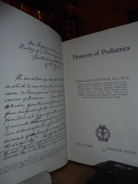 Abraham Levinson, B.S., M.D. New York, Froben Press, 1943. Pioneers of Pediatrics. Seconda edizione. In-8°, tela edit. 119 pp. con numerose tavole n.t. Bell' esemplare. Neg. sotto esot.