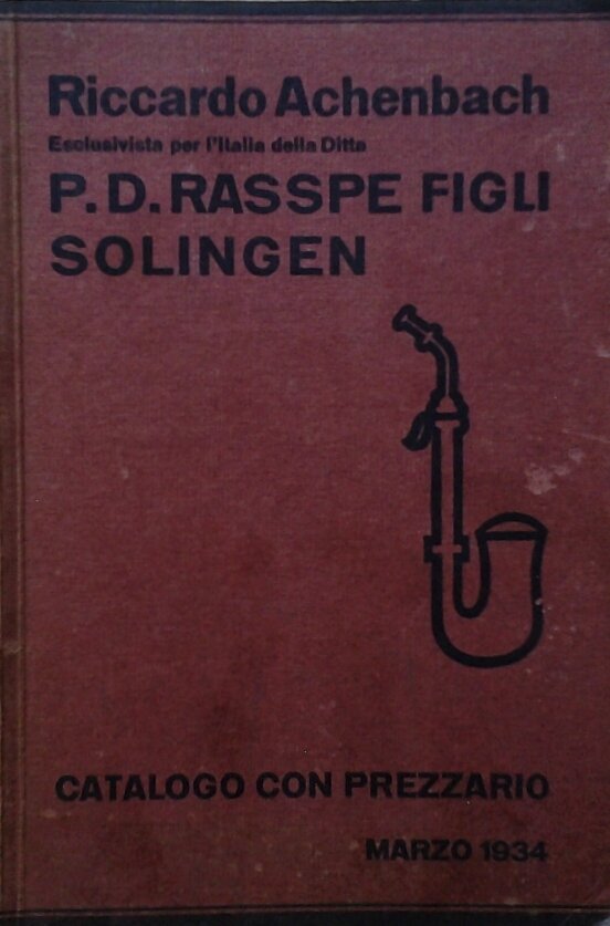 In-8, brossura, pp. 454, con numerose illustrazioni in bianco e nero nel testo. Riccardo Achenbach esclusivista per l'Italia della ditta P.d. Rasspe Figli SolingenRiccardo Achenbach esclusivista per l'Italia della ditta P.d. Rasspe Figli Solingen. Catalogo.In buono stato (good copy).