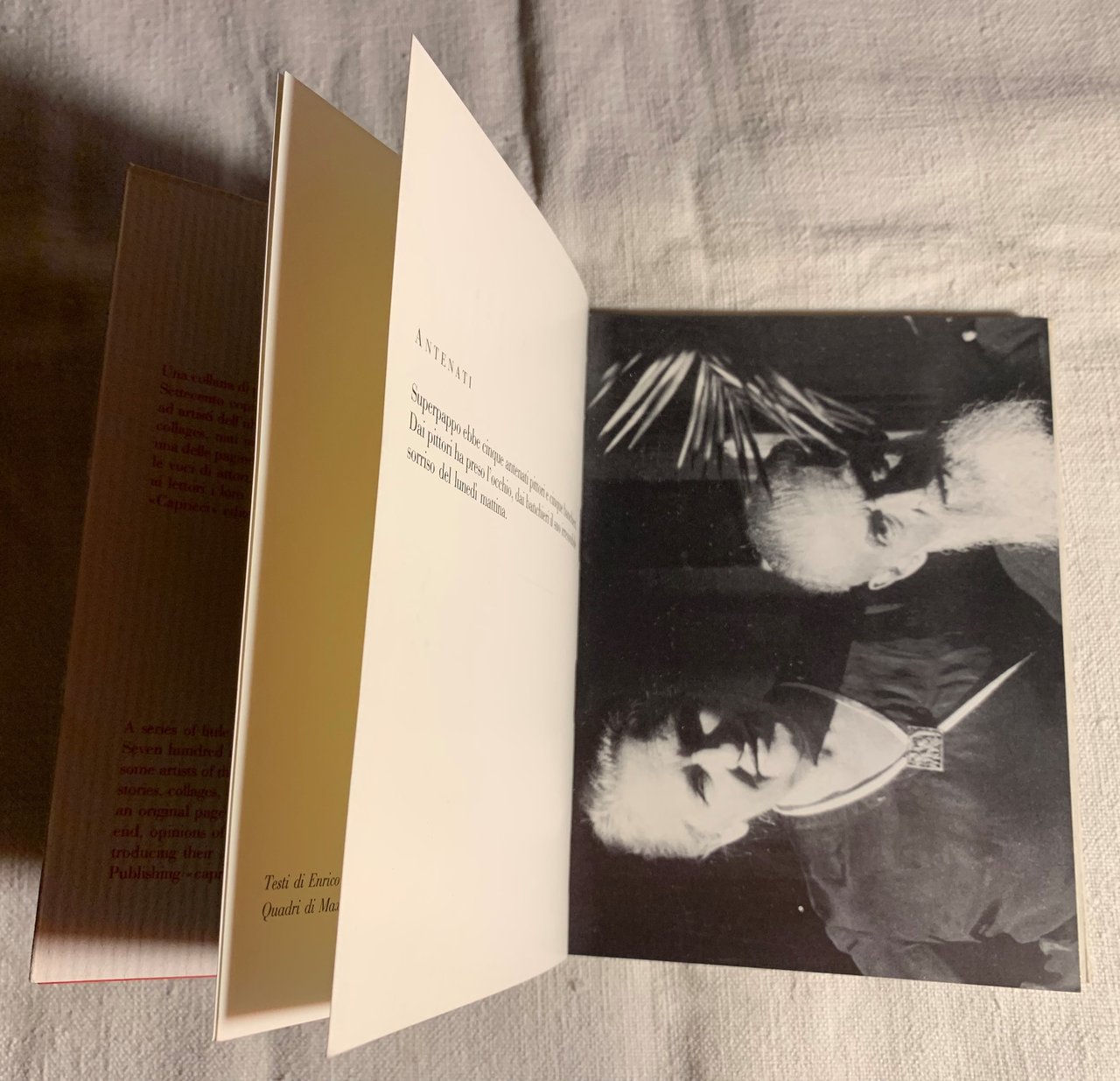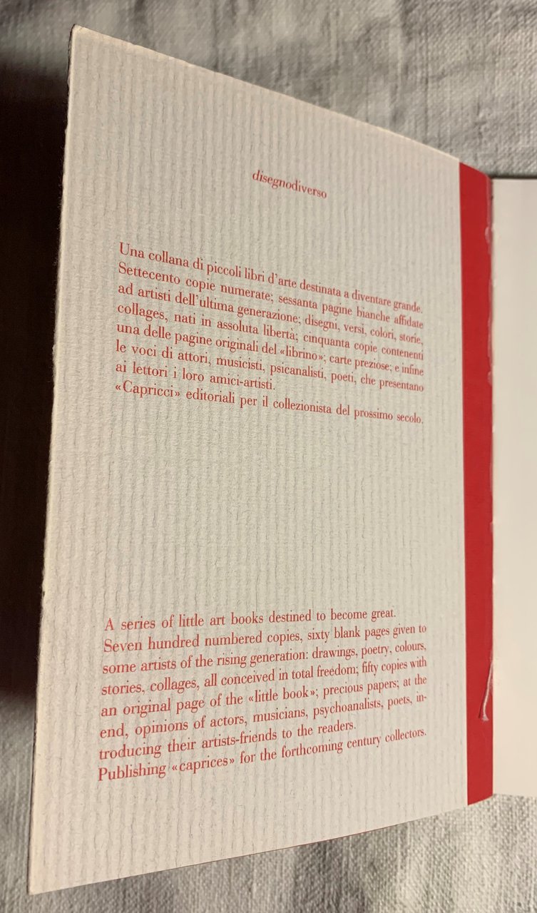 I ed. limitata a settecento copie numerate. Gli esemplari da 1 a 50 contengono un'opera originale dell'artista (esemplare n^ 511, senza opera originale dell'artista. Finito di stampare nel mese di maggio mille novecento novantatre). Collana a cura di Paola Gribaudo disegnodiverso. XVI/ (64) in carta Larius Matt Satin/ brossura in carta Nettuno cremisi / sovraccoperta in carta Italia grigio chiarissimo con grafica in cremisi. Illustrazioni a colori di Max Pellegrini. Stato buono. Indice: testi e immagini (Antenati - Mondano - Genealogie - Nascita - Educazione - Maturità - Matrimonio - Prima e dopo il matrimonio - I rabbits - Multidimensionale - Pittura - Grazie - Studi - L'orecchio e gli occhi - Ottimista? - Panteista - Inquietudini - Inquietudini crescono - Tipofisico - Incidente - Complici - Creativo - Chi è? - Dedica) - Ode alla stagione/ Ode to a season; Simone di Collobiano.