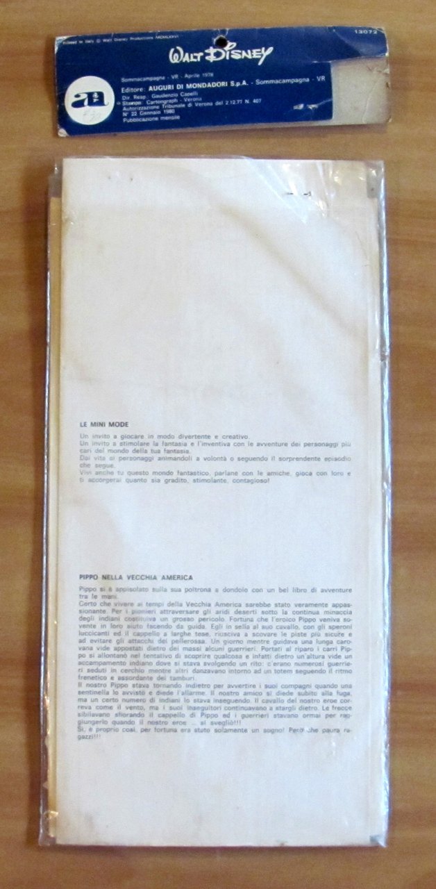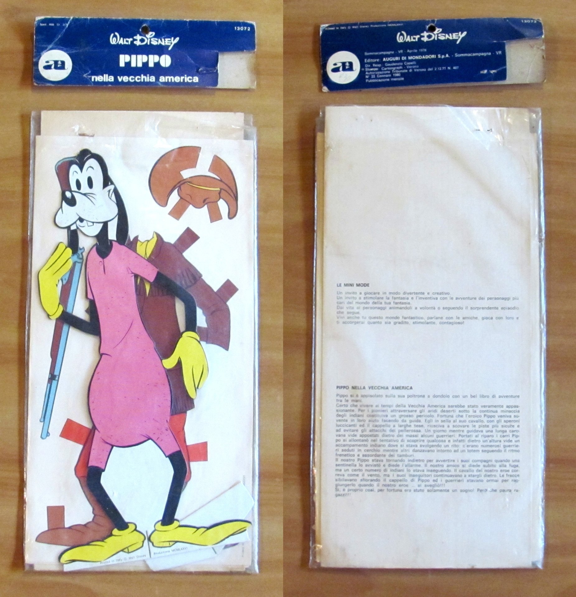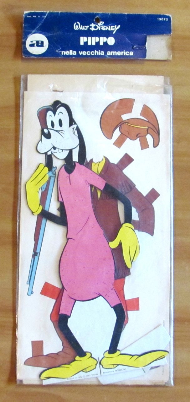 Silhouettes di Pippo con 2 Costumi da ritagliare e montare. Editore Auguri Mondadori, 1980. Blister aperto al margine superiore e relativo cartoncino di chiusura staccato ma presente. Contiene Silhouettes di Pippo in cartoncino spesso con basettina ad incastro per tenerlo in piedi e 2 cartoncini leggeri con i costumi da ritagliare e montare a scelta. Busta 18x36 - Pippo 14,5x32,5. Raro e in Ottimo stato.