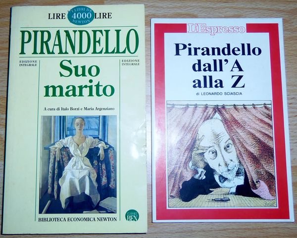 [Pirandello Sciascia Letteratura]2 volumi in brossura editoriale a colori: 1- Pirandello dall'A alla Z di L. Sciascia (cm. 20) -pp. 50. Ricco di immagini in nero sulla vita di Pirandello, questo volume pubblicato in occasione del cinquantenario dalla morte del pi˘ enigmatico fra gli scrittoori italiani, in 26 voci l'Autore delinea un ritratto completo di Pirandello. perfette condizioni, solo lievi bruniture dovute al tempo. 2- "Suo marito" edizione integrale, (cm. 22) -pp. 223, romanzo che occupa un posto di rilievo per lo studio dell'evoluzione letteraria e per l'estetica pirandelliana. Volume con lievi mende al taglio esterno, ed ombreggiature dovute al tempo ai margini, ma ben integro e completo.