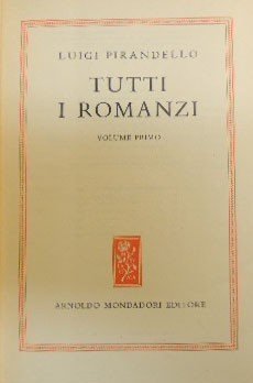 Luigi Pirandello, Tutti i romanzi, Arnoldo Mondadori Editore, Milano 1955-1956, 2 voll., pp. 1484, cm 21, tela ed. con titoli in oro al dorso, decorazione al piatto e sovr. Collana Omnibus. Vol. I (1955, settima ed.): L’esclusa – Il turno – Il fu Mattia Pascal – Giustino Roncella nato Boggiòlo. Vol. II (1956, terza ed.): I vecchi e i giovani – Quaderni di Serafino Gubbio operatore – Uno, nessuno, centomila. Volume primo: evidenti tracce d’uso alla sovraccoperta, con strappi riparati con nastro adesivo e una mancanza, uno strappo al dorso, cerniera anteriore molto allentata e cerniera posteriore fessurata. Volume secondo: leggere tracce d’uso alla sovraccoperta, con qualche strappetto senza mancanze, accenni di fioriture ai tagli, per il resto buona copia.