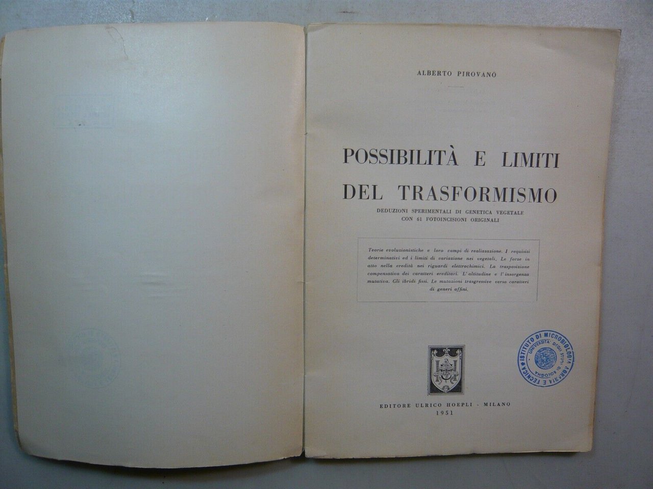 Pirovano,POSSIBILITA’ E LIMITI DEL TRASFORMISMO,Hoepli, 1951[botanica,incisioni