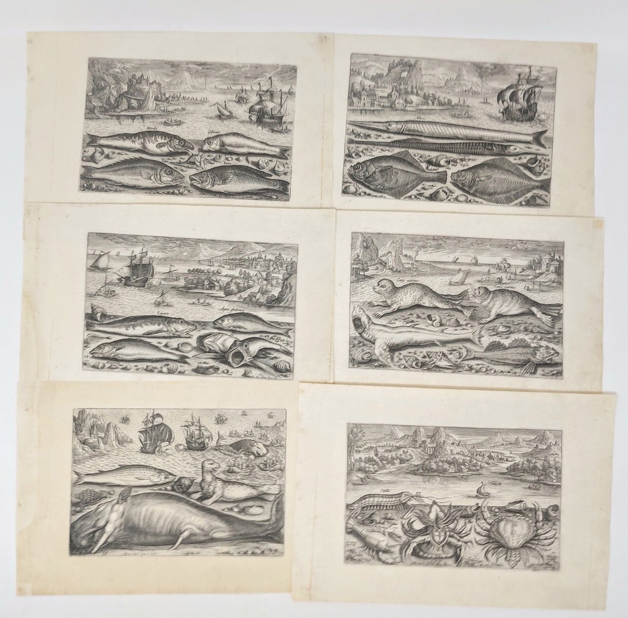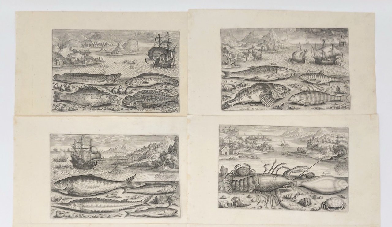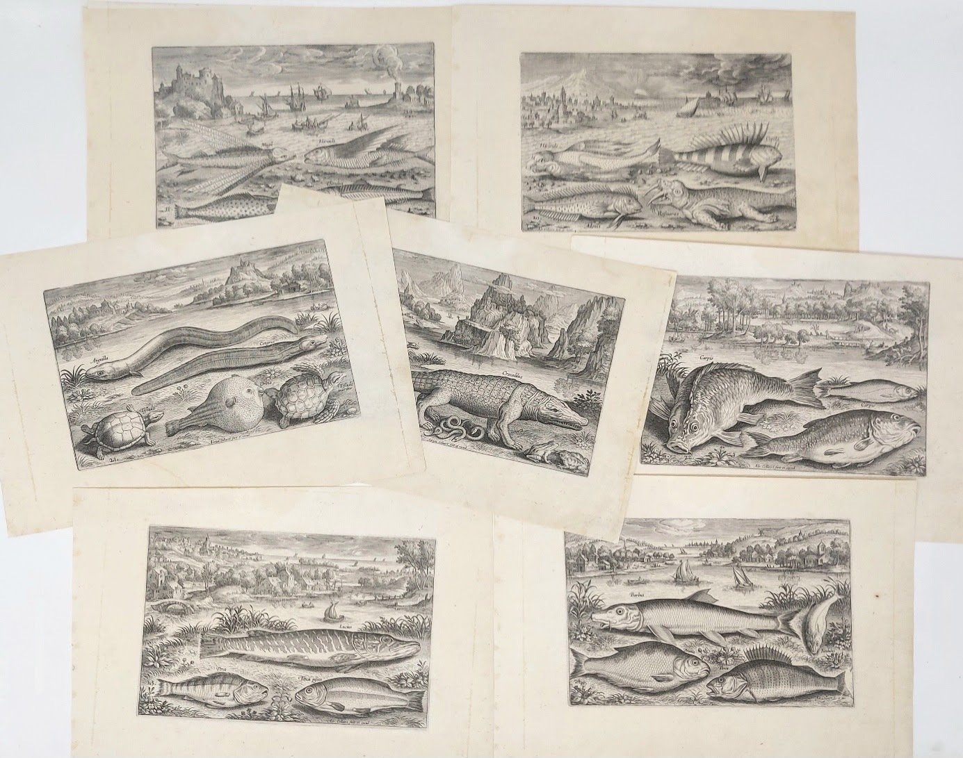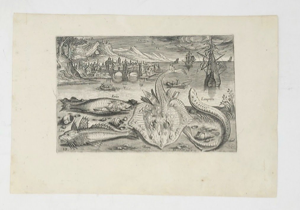Prima edizione di questa famosa raccolta d'incisioni di pesci, balene, tartarughe, testuggini, molluschi, crostacei e coccodrilli. Adriaen Collaert raggruppa la fauna marina in gruppi simili, fornendo a ciascun elemento il suo nome scientifico. Il paesaggio sullo sfondo è tratto dalle vedute montuose e dagli edifici dipinti da Pieter Brueghel il Vecchio. Le conchiglie sparse in primo piano non sono identificate con un nome, nonostante siano fedelmente riprodotte svolgono un ruolo meramente decorativo. Alla fine del XVI secolo, la storia naturale era basata sull'osservazione diretta e la rappresentazione della natura svolgeva un ruolo essenziale nello sviluppo del metodo scientifico.