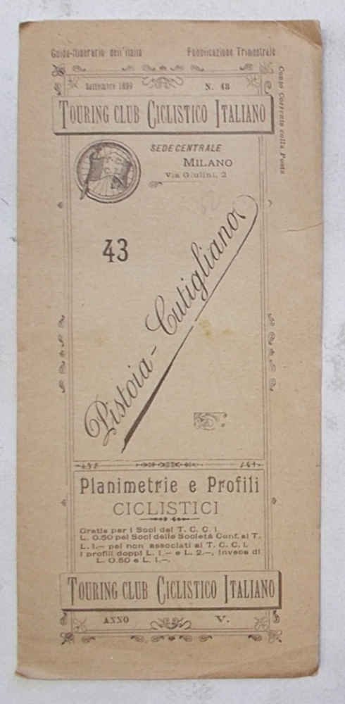 Tavola di 8 facciate di cm. 21 x 8 (perciò lunga cm. 64 circa). VG. ** Verificato sul terreno nel giugno 1899. Le "Planimetrie e profili ciclistici" del Touring Club Ciclistico Italiano sono una collezione di pubblicazioni che ha qualcosa, anzi è più esatto dire molto! di epico: i 57 itinerari, pubblicati in 51 fascicoli tra il 1896 e il 1901, Luigi Vittorio Bertarelli, il fondatore del T.C.I., se li è fatti tutti in bicicletta, appuntando ogni informazione utile su un taccuino. Ogni itinerario è descritto su una lunga tavola, che si svolge orizzontalmente e che è ripiegata in una copertina con titoli, fregi e piccolo stemma del T.C.C.I. La tavola presenta un profilo altimetrico a tre colori e la cartina dell'area, con il tracciato evidenziato in rosso. Il profilo, oltre alle quote, contiene l'indicazione delle distante, della qualità delle strade (polverose, discrete, buone.), delle tappe e altre notizie utili (sorgenti, "splendido panorama", hotel, ristoranti, servizi postali.).