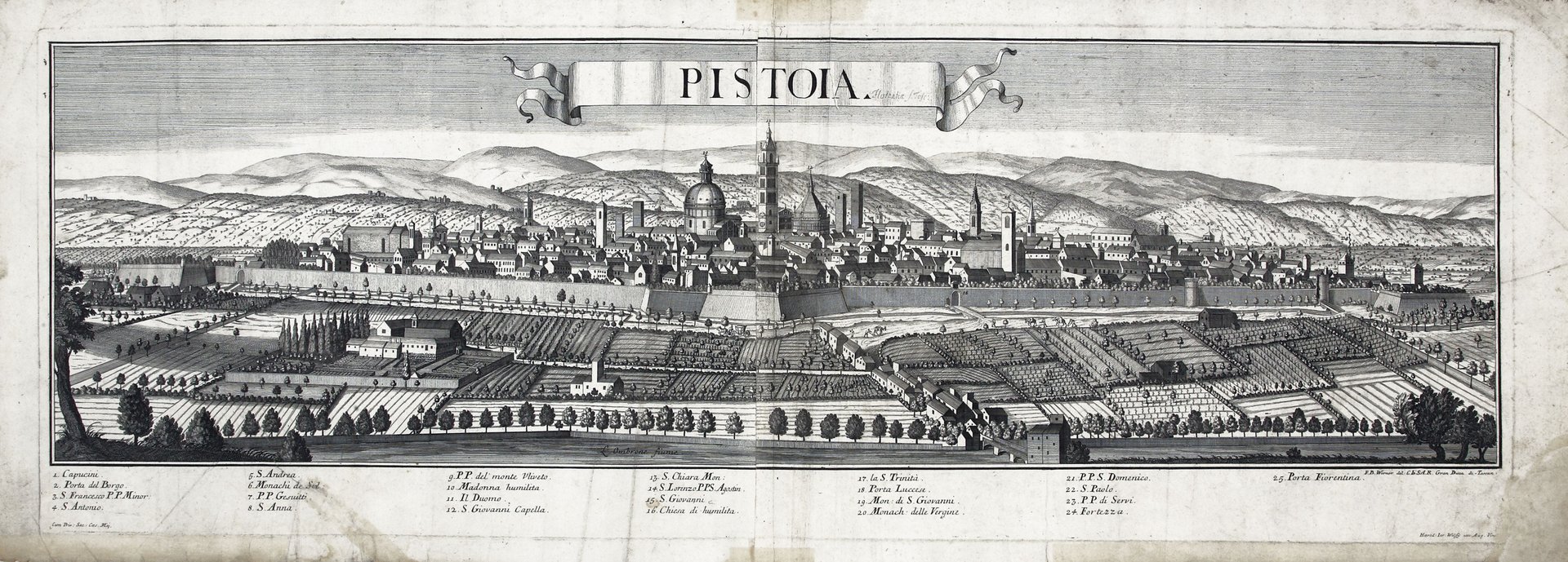 Acquaforte firmata “F. B. Werner del. - C. L. S. A. R. Gran Duca di Toscana-Hared. Ier Wolffy. exc. Aug. Vind”. (mm 350x1010). In alto al centro il titolo "Pistoia". Legenda di 25 richiami in italiano, lungo il lato inferiore. Difetti restaurati lungo il margine inferiore bianco, strappo di 5 cm restaurato che intacca la legenda.