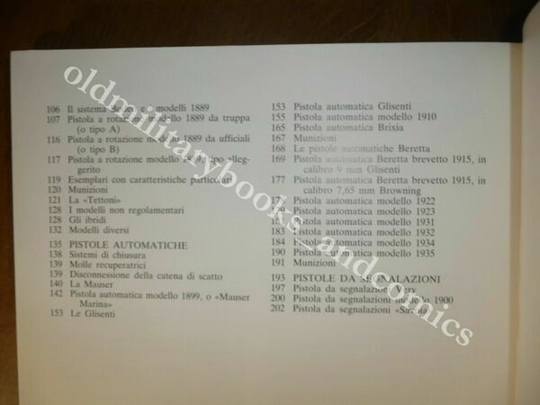 DESCRIZIONE: Olimpia Firenze 1985, br. ed. similpelle con sovracc. ill. a colori, pp. 207 con f. b/n n.t. in 4°. Molte illustrazioni con foto e disegni con le varie parti delle armi. Rassegna completa dei modelli in dotazione allesercito piemontese e italiano durante il Risorgimento e fino alla WWII. Unico testo che descrive dettagliatamente le pistole italiane in oltre un secolo di storia. Per ogni arma: storia, foto, disegni, spaccati con dettagli delle parti e descrizione tecnica Una rassegna completa e organica di oltre 50 pistole accuratamente descritte e illustrate con 200 foto e 90 disegni di pistole, parti e particolari e sequenze di funzionamento. CONDIZIONI: Ottime. PESO / WEIGHT: 1200 gr. without package