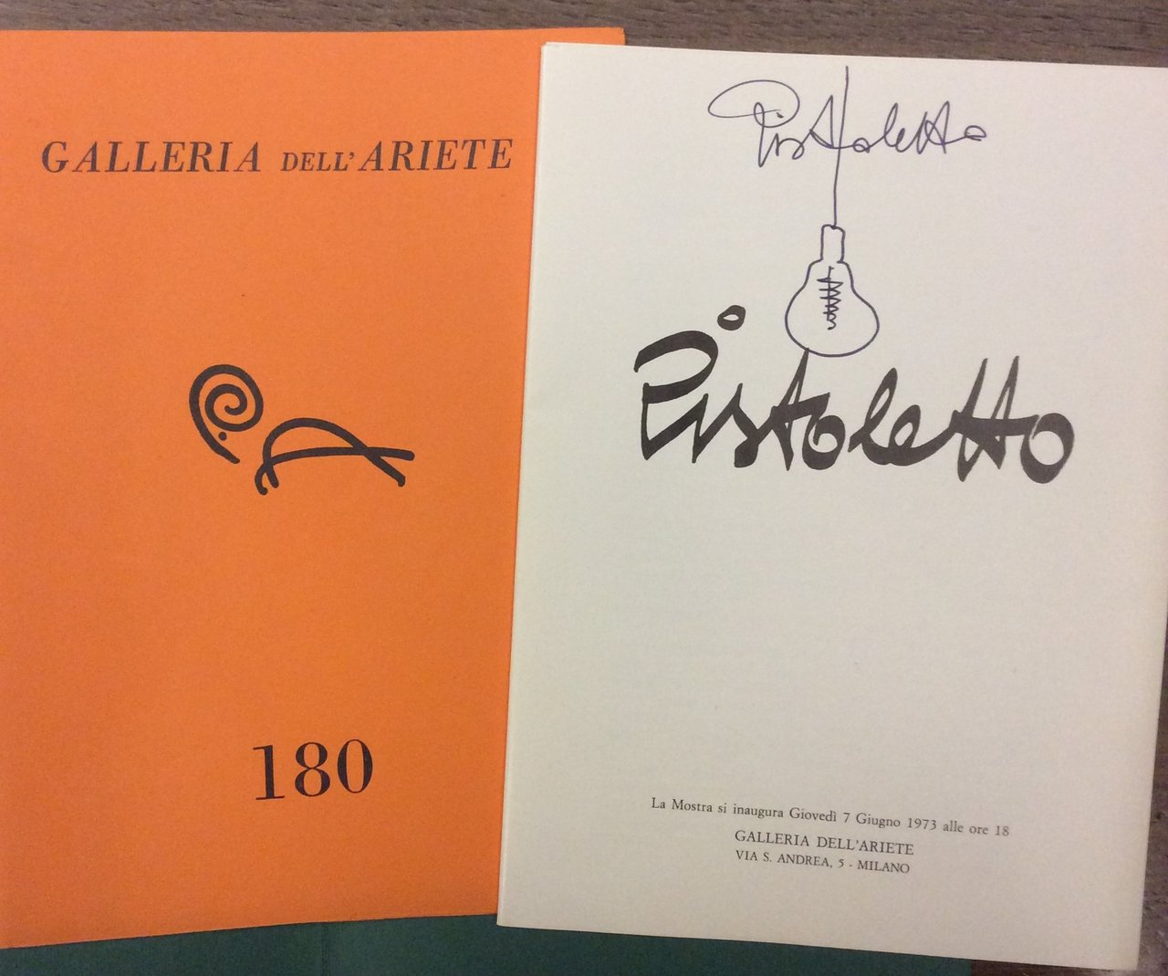 In-8 p., cartellina editoriale in brossura che contiene, a fogli sciolti, pp. (36) illustrate in bianco e nero. Per la seconda mostra alla Galleria dell'Ariete, Pistoletto mette in scena un catalogo fortemente connotato come lavoro d'arte. Il testo critico è opera dello stesso artista e la rappresentazione delle opere è affidata ad una sequenza di immagini fotografiche di Antonia Mulas che documentano il momento dell'allestimento della mostra. L'opera è sostituita non solo dalla sua rappresentazione, ma dall'atto performativo della costruzione della mostra. Cfr. Maffei, Arte povera 1966-1980, p. 167. Catalogo della mostra inaugurata Giovedì 7 Giugno 1973. Ben conservato, con un disegno e la dedica autografa di Pistoletto al frontespizio.