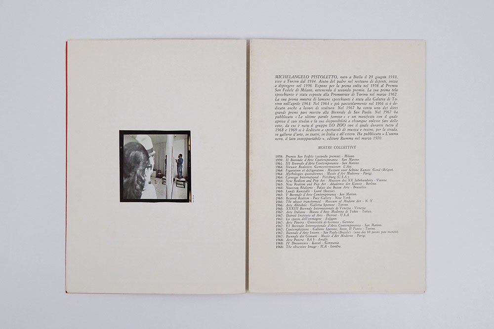 LIBROEdizione originale.Esemplare in ottime condizioni.Nel catalogo, il numero 156, stampato in occasione della mostra di Pistoletto organizzata dalla Galleria dell’Ariete, sono pubblicate due fotografie di Ugo Mulas, una tavola che riproduce i provini delle fotografie di Giorgio Colombo, scattate durante l’allestimento, e il testo critico “Mai zu: del critico” firmato da Tommaso Trini. La pubblicazione fungeva anche da invito: «Invito a incontrare Michelangelo Pistoletto presso la Galleria dell’Ariete alle ore 19 di martedì 24 marzo. Invito a leggere il libro “L’uomo nero, il lato insopportabile” di Pistoletto, edito da Rumma, che verrà presentato per l’occasione nel corso di una trasmissione pirata. Invito a visitare quotidianamente i lavori che Pistoletto eseguirà durante il periodo destinato alla mostra. [.] Invito a inserire nella presente copertina il catalogo della mostra che sarà distribuito lo stesso giorno a chiusura di tutto». Come mostra il testo appena citato, con tutta probabilità il primo foglio, su cui è stampato il testo con gli “inviti” ebbe diffusione autonoma, mentre le pagine del catalogo vero e proprio furono distribuite solo ai visitatori della mostra e inserite nella cartellina in un secondo momento: l’OPAC infatti registra la pubblicazione come semplice “invito” e riporta l’indicazione di [4] pp. e non le [12] pp. della pubblicazione completa. La presentazione del libro “L’uomo nero, il lato insopportabile” fu organizzata il 21 aprile 1970, sempre presso la galleria, con una performance documentata dalle fotografie di Ugo Mulas.G. Maffei, Arte Povera 1966-1980 - Libri e documenti - Books and documents, Mantova, Corraini, 2007, pp. 164-165.