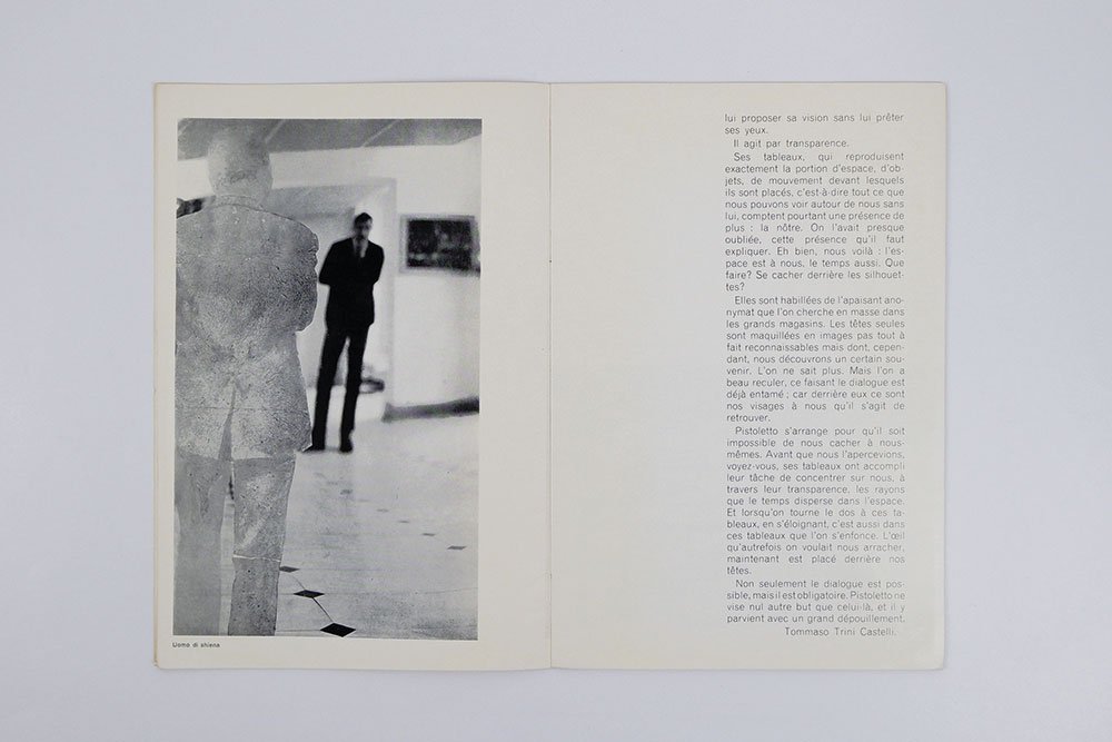 LIBROEdizione originale.Lievemente brunito ai bordi, per il resto un ottimo esemplare.Catalogo e libro d’artista pubblicato in occasione della terza mostra personale dell’autore, nonché prima esposizione internazionale organizzata presso la Galleria Ileana Sonnabend di Parigi e inaugurata il 4 marzo 1964. I testi critici, entrambi redatti in francese, sono a cura di Tommaso Trini Castelli, Alain Jouffroy e Michael Sonnabend (che firma M.S.), e sono accompagnati da sei immagini in bianco e nero delle opere dell’artista (tre delle quali impaginate su una tavola ripiegata).G. Maffei, Arte Povera 1966-1980 - Libri e documenti - Books and documents, Mantova, Corraini, 2007, p. 176.