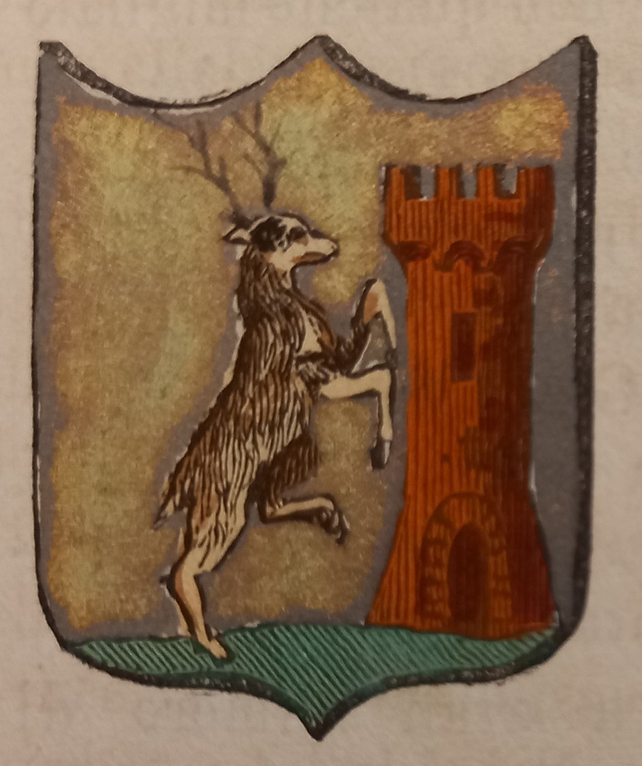 Piccolo stemma comunale colorato a mano d’epoca (cm. 3,8 x 3,2 ca.). Stralcio dal Dizionario Corografico illustrato dell’Italia, edito a Milano nel 1868. Ogni stemma di questa raccolta è inserito in una o più pagine di testo con la descrizione della località, notizie storico - geografiche e statistiche (numero degli abitanti e degli elettori, guarnigioni della Guardia Nazionale, ecc.). Spesso il testo è redatto da studiosi locali o dai sindaci, con maggiori, interessanti notizie.
