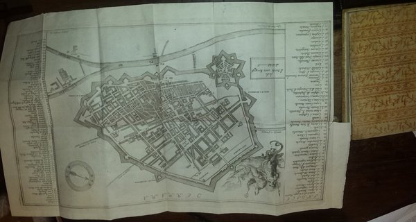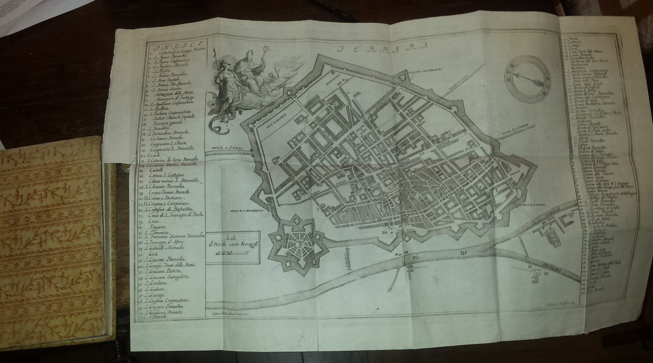 In-8 (19,7 cm) (2) 223 (3) (1) c. (pianta topografica di Ferrara). Fregi e iniziali xilogr. Elegante legatura in mezza pergamena con piatti decorati. Tagli spruzzati. Il nome dell'autore si ricava dalla prefazione. La bella carta calcografica di Ferrara 56 x 32,5 cm, più volte ripiegata, slegata, è stata disegnata dall'autore nel 1770 e incisa da Giuseppe Mandolini, riporta i rimandi a tutte le chiese e i monumenti della città. Interessante guida artistica di Ferrara, non comune da trovare completa della sua carta. Ottimo esemplare.