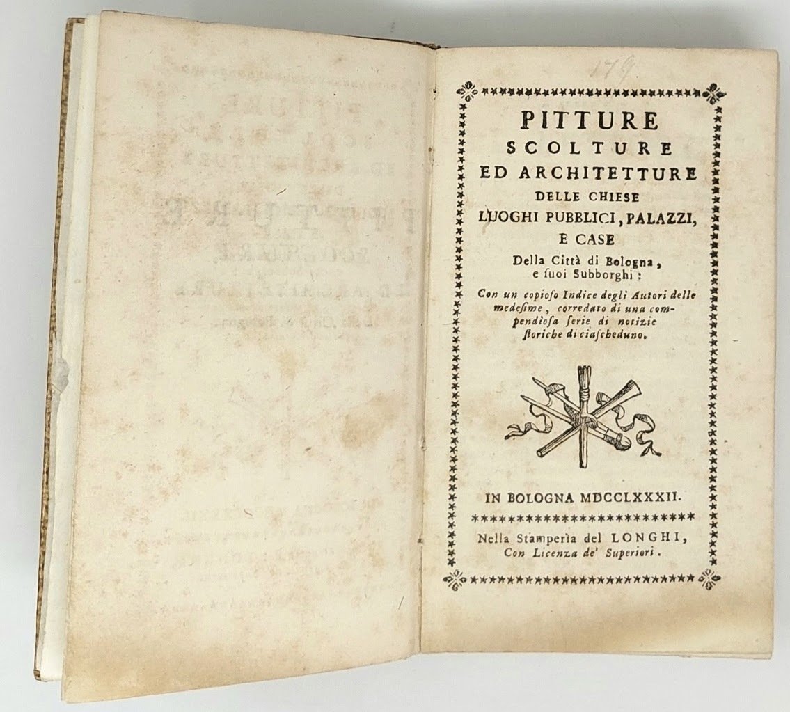 >in-12, pp. XXIV, 600, leg. cart. epoca. Edizione ampliata di questa celebre fortunata guida artistica di Bologna (apparsa per la prima volta nel 1686), la quale, oltre che delle pitture di cui si occupavano le prime edizioni, tratta anche di scultura ed architettura. L'ultima parte (pp. 429-595) contiene un ''copioso indice degli autori delle medesime (opere d'arte), corredato di una compendiosa serie di notizie storiche di ciascheduno''. Buon esemplare, lieve ed uniforme brunitura della carta.  Cicognara 4177. Schlossser-Magnino p. 581.