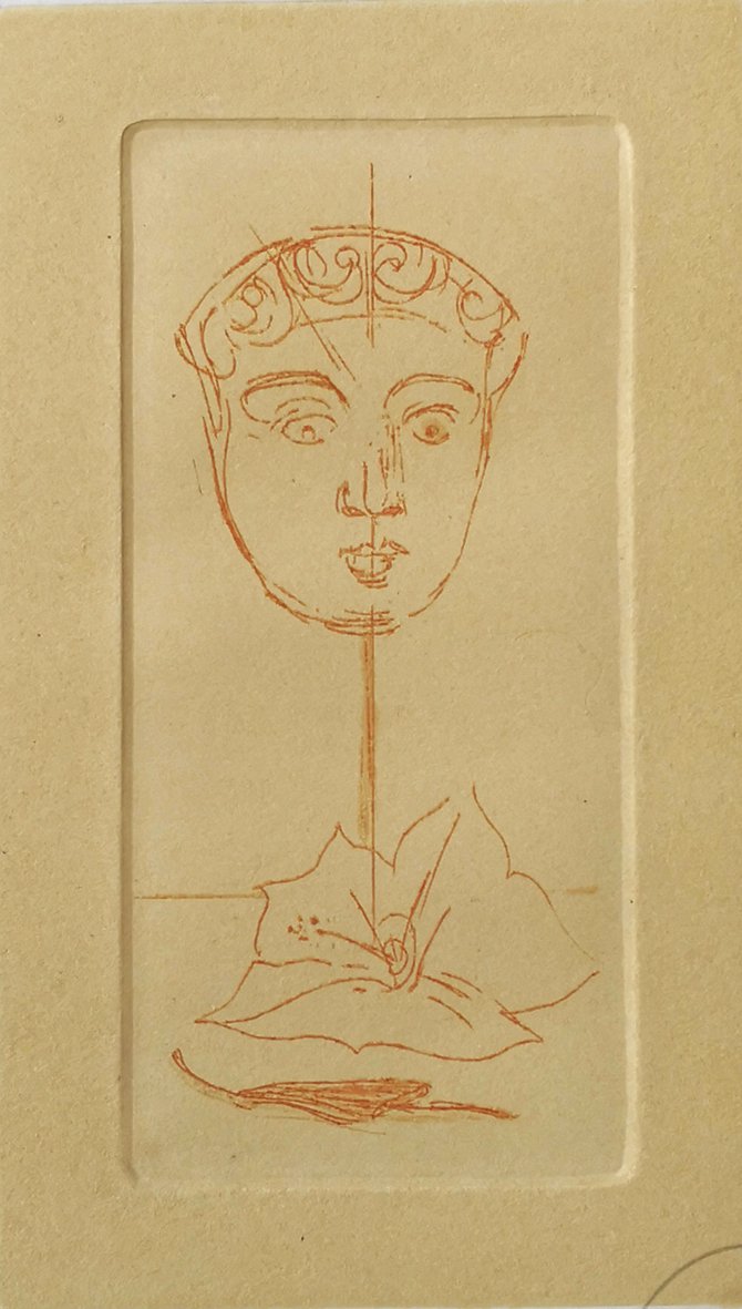 8°; pp. 12 con, sciolta, un'acquaf. acquatinta originale di Guccione "La maschera e l'ibisco" numerata e firmata a matita. Ediz. tirata a 50 esempl. numerati, oltre a XV num. romana. Brochure edit. con titoli al piatto, cordoncino decorativo al dorso. Una leggera piega al piatto anteriore.<BR>(vedi riproduz.)