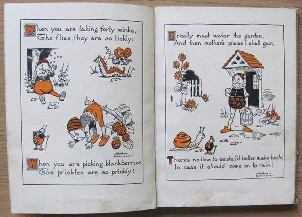 Illustrazioni a due colori a tutte le pagine di cui 6 a piena pagina. Publ. Birn Brothers Ltd - London, s.d. primi '900. Cartonato editoriale con dorso in tela originale. Usure ai margini delle copertine e dedica del tempo al risguardo. Lievi fioriture del tempo a qualche pagina. 19x25,5; pp.58 non numerate. Raro, Buono stato. , Molto buono (Very Good)