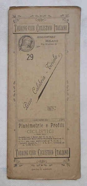 Tavola di 12 facciate di cm. 21,5 x 8,5 (perciò lunga cm. 102 circa). VG. ** Verificato sul terreno nel maggio 1897. Le "Planimetrie e profili ciclistici" del Touring Club Ciclistico Italiano sono una collezione di pubblicazioni che ha qualcosa, anzi è più esatto dire molto! di epico: i 57 itinerari, pubblicati in 51 fascicoli tra il 1896 e il 1901, Luigi Vittorio Bertarelli, il fondatore del T.C.I., se li è fatti tutti in bicicletta, appuntando ogni informazione utile su un taccuino. Ogni itinerario è descritto su una lunga tavola, che si svolge orizzontalmente e che è ripiegata in una copertina con titoli, fregi e piccolo stemma del T.C.C.I. La tavola presenta un profilo altimetrico a tre colori e la cartina dell'area, con il tracciato evidenziato in rosso. Il profilo, oltre alle quote, contiene l'indicazione delle distante, della qualità delle strade (polverose, discrete, buone.), delle tappe e altre notizie utili (sorgenti, "splendido panorama", hotel, ristoranti, servizi postali.).