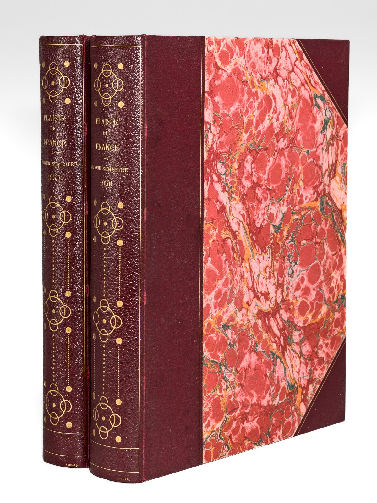 2 vol. grands in-4 reliure demi-percaline lie de vin à coins signée Richard, couvertures conservées, ill. noir et blanc ou couleurs, Les Publications de France, 1950, env. 70-XX pp. par numéro, soit environ 900 pp. au total. Etat très satisfaisant (lég. rouss. sur tranches, 1 feuillet détaché, très bon état par ailleurs). Peu courant ainsi relié. D'autres années, reliées dans le même style, sont disponibles dans notre catalogue. "Plaisir de France" était une revue de prestige, lancée en 1934 par le Rayonnement français, une filiale du groupe familial Baschet. A partir de 1936, et jusqu'en 1968, elle fut dirigée par Olivier Quéant (1898-1988). Cette revue, réputée pour son esthétique et sa qualité graphique, fusionna en 1974 avec "Connaissance des Arts".