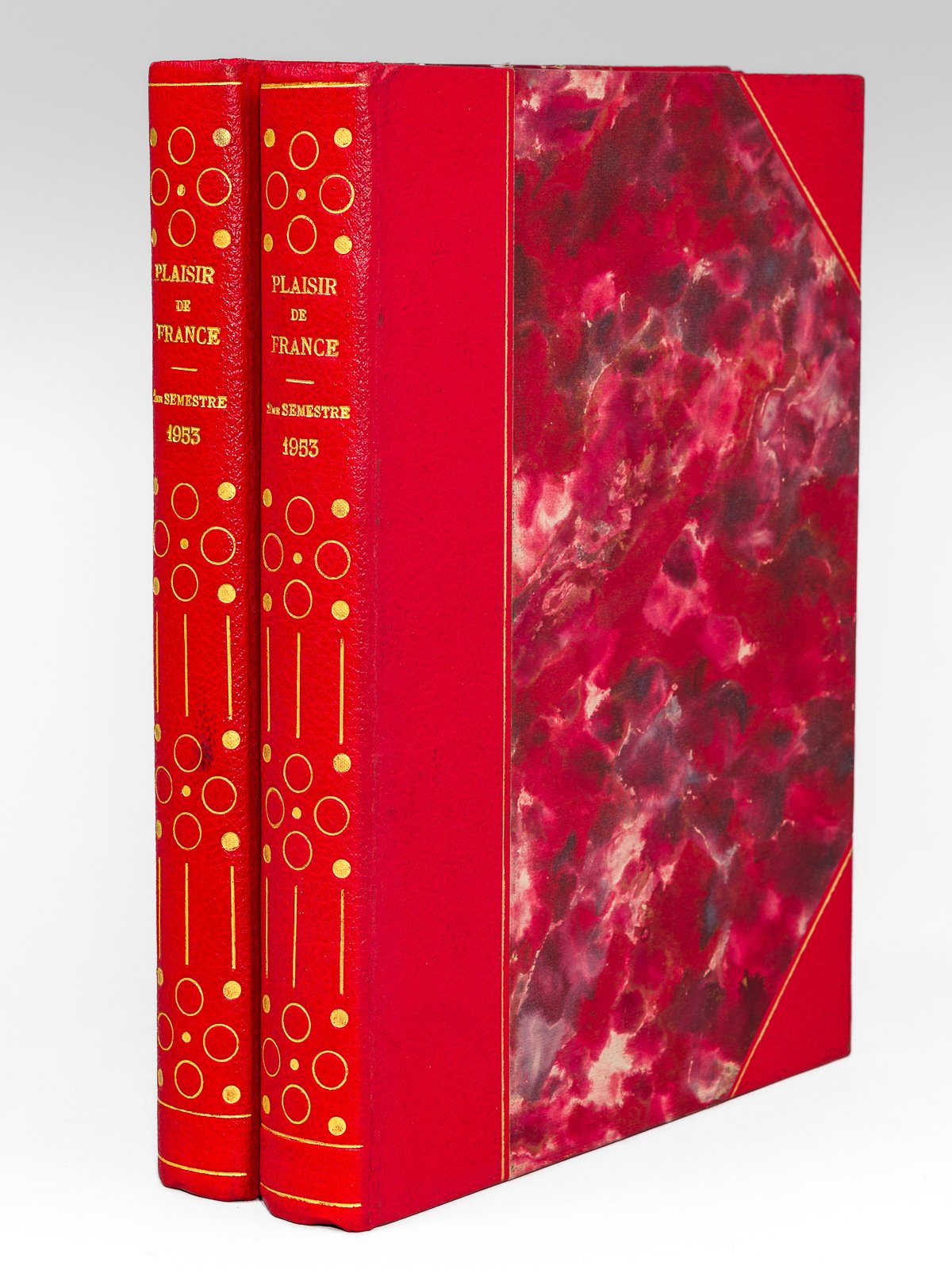 2 vol. grands in-4 reliure demi-percaline rouge à coins signée Richard, couvertures conservées, ill. noir et blanc ou couleurs, Les Publications de France, 1953, env. 70-XX pp. par numéro, soit environ 900 pp. au total. Bel exemplaire (lég. rouss. sur tranches, très bon état par ailleurs). Peu courant ainsi relié. D'autres années, reliées dans le même style, sont disponibles dans notre catalogue. Il est à noter que 153 fut la dernière année où la publication de cette revue de luxe se limitait à 10 numéros. A partir de 154, la publication passa à 12 numéros par an. "Plaisir de France" était une revue de prestige, lancée en 1934 par le Rayonnement français, une filiale du groupe familial Baschet. A partir de 1936, et jusqu'en 1968, elle fut dirigée par Olivier Quéant (1898-1988). Cette revue, réputée pour son esthétique et sa qualité graphique, fusionna en 1974 avec "Connaissance des Arts".