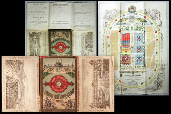 curioso pieghevole applicati su legno con una piantina a colori (aperta formato 29,5X39 cm circa) ed una vera bussola al centro (non funzionante) stampato in occasione dell'Esposizione Universale; buon es.