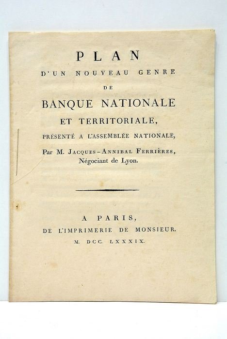 13 pages. (26x20 Cm). Broché à l'époque sans couverture. Quelques rousseurs. Projet de banque "territoriale" fondée sur la "valeur réelle des terres, franches et quittes de toute hypothèque, dans toute l'étendue du Royaume". L'auteur était un négociant de Lyon. Un exemplaire de ce projet de banque figurait dans la bibliothèque de Lavoisier. Bel exemplaire, broché, tel que paru.