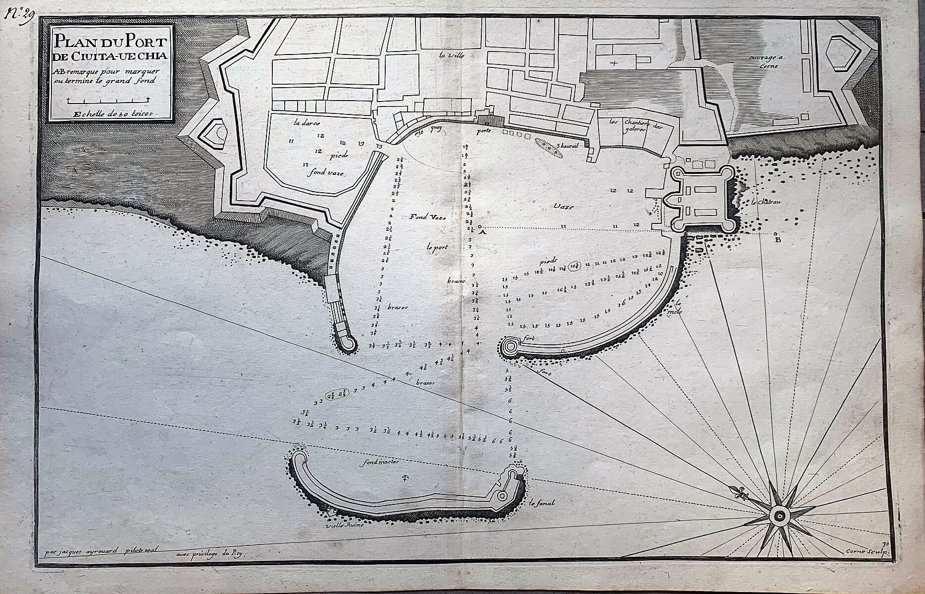 >Incisione in rame (mm 300x455 e margini). Firmata in lastra in basso a sinistra: ”Par Jacques Ayrouard pilote real avec privilege du Roy . In alto a sinistra entro grande cartiglio il titolo e la scala miliare. Tratta dall' atlante nautico "Recueil de plusieurs Plans des Ports et Rades et de quelques Cartes particulières de la Mer Méditerranée, avec les figures des Terres remarquables pour les reconnoissances des Atterrages", edito tra il 1732 ed ll 1746. Jacques Ayrouard, idrografo francese, risulta attivo tra il 1730 ed il 1750; il raro atlante dei porti del Mediterraneo rimane la sua unica opera. Questo atlante nautico sarebbe stato successivamente disegnato da numerosi idrografi, in particolare William Heather che cita Ayrouard nel suo “New Mediterranean Pilot” del 1802. L'incisore, Louis Corne, è noto a Tooley esclusivamente da questo lavoro.Bell'esemplare in buono stato di conservazione, numerata a mano nell'angolo superiore destro. The Map Collector, Issue 24, p.49.