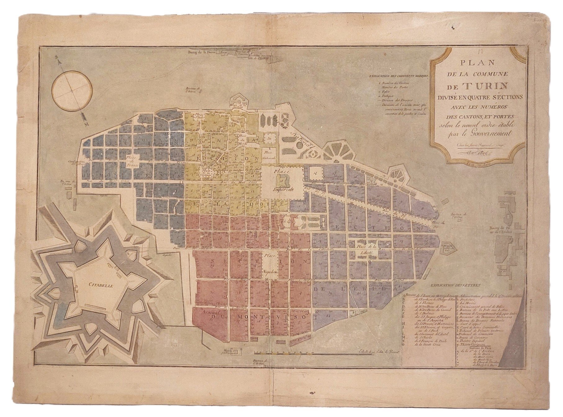Dettagliata carta topografica della città, con la cittadella. Nel 1802 si completò il passaggio formale della amministrazione comunale di Torino a quella francese. A Torino si abbandonarono formalmente gli schemi antichi per i nuovi. Dopo l'ordine emanato dal governo la città fu suddivisa in 4 distretti: Section du Mont Cenis; Section de la Doire, Section de l'Eridan, Section du Montviso. La pianta appartiene al periodo di governatorato, presenta nuovi nomi per le vie, le piazze e gli isolati della città. Appare priva delle fortificazioni, sono messe in evidenza le parrocchie e le porte secondo il nuovo governo, con la divisione militare e di giustizia.