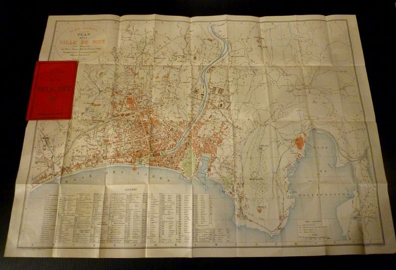 Bella, dettagliata pianta della città di Nizza e dintorni, nella cartellina editoriale in tela rossa con titoli e cornici in oro (cm 14,5 x 9,5); aperta misura cm 56 x 75; cartiglio in alto a sinistra, legenda in basso. Buono stato di conservazione.