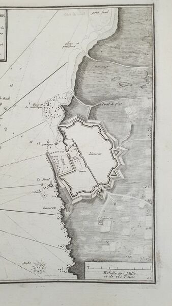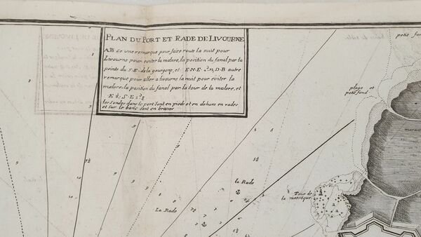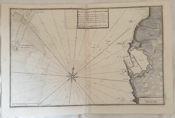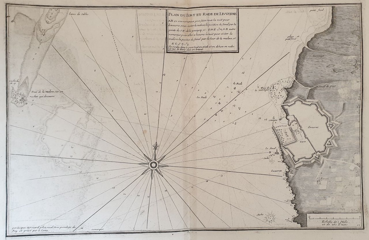 Mappa nautica originale del 1732 incisa da Louis Cornè su disegno dell'idrografo Jacques Ayrouard, il porto di Livorno. PLAN DU PORT DE LIVOURNE INCISIONE: incisione su rame ATLANTE: Recueil de plusiers plans des ports et rades et de quelques cartes particulieres de la Mer Mediterranee AUTORE: Jacques Ayrouard INCISORE: Louis Corne DIMENSIONI FOGLIO: cm 50,5x33,5 DIMENSIONI INCISIONE: cm 45,5x29,5 EPOCA: 1732 CONDIZIONI: buone condizioni. Piegatura verticale. L'inchostro dell'incisione ha macchiato una facciata della mappaSea map original of 1732 engraved by Louis Cornè after the hydrographe Jacques Ayrouard, the harbour of Longosardo in the area of Santa Teresa di Gallura. PLAN DU PORT DE LIVOURNE ENGRAVING: copper woodcut ATLAS: Recueil de plusiers plans des ports et rades et de quelques cartes particulieres de la Mer Mediterranee AUTHOR: Jacques Ayrouard ENGRAVER: Louis Corne LEAF DIMENSION: cm 50,5x33,5 ENGRAVING DIMENSION: cm 45,5x29,5 DATE: 1732 CONDITIONS: good conditions. Vertical folding. The ink of the engraving has stained a part of the map