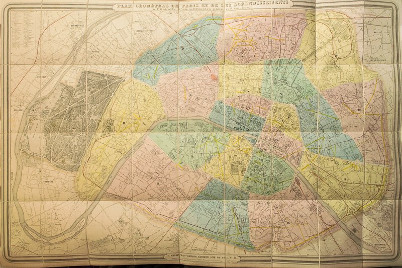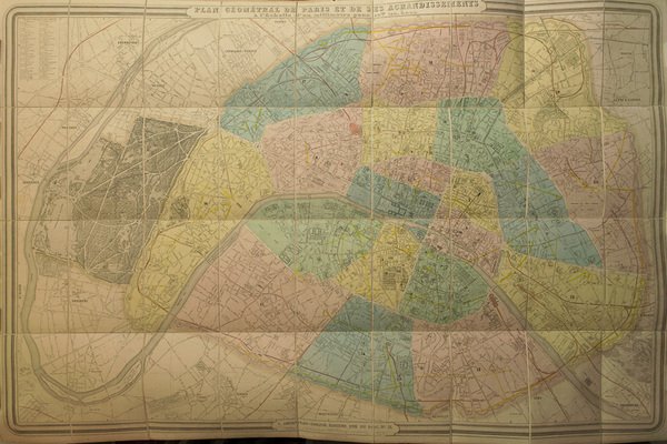 1 carte entoilée dépliante sous chemise cartonnée et étui au format 104 x 156 cm, en couleurs, E. Andriveau-Goujon, Paris, 1867 Rare et bon exemplaire de cette carte de Paris en grand format, nous présentant la capitale à la fin du Second Empire, à la veille du Siège de Paris et de la Commune (la chemise est abîmée, l'étui est en bon état). D'une échelle et d'un format supérieur aux autres productions d'Andriveau-Goujon, elle englobe l'intégralité de la boucle de la Seine avec Boulogne et son bois, jusqu'à Saint-Cloud et Suresnes.