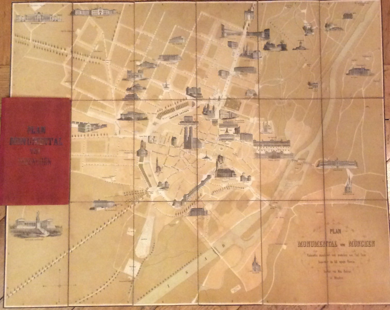 In-16 p., tela editoriale, pp. 32 di Notizen zum Gebrauche des Planes + 1 grande e bella piantina di Monaco (cm. 46x57) con raffigurati i suoi principali monumenti su sfondo beige, suddivisa in 18 riquadri e montata su tela, è ben conservata.